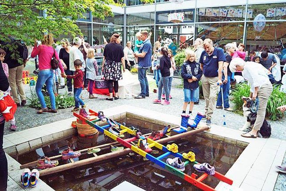 Preetz (sh). Zwei Worte in einer fremden Sprache gesprochen. Jetzt die richtige Landesflagge dazu drücken. Gar nicht so einfach. War das Syrisch, Französisch oder gar Schwyzerdütsch? An einer Litfaßsäule hängen 16 Länderfahnen, vom Laptop kommen die Stimmen der Kinder. Alle sagen sie „Miteinander – Zueinander“ in ihrer Sprache. Das ist das Motto des diesjährigen Skulpturengartens in der Friedrich-Ebert-Schule (FES). Bereits zum 9. mal verwandeln sich das Atrium und einige Klassenzimmer der FES in eine wunderbare Phantasiewelt – dann wird der mit kleinen Teichen, Bäumen und Blumenrabatten versehene Innenhof über Nacht zu einem Ort der Kunst, gestaltet von allen Schülern der ersten bis vierten Klasse. Seit Freitag lädt der feierlich eröffnete Skulpturengarten wieder zum Schauen, Staunen, Fühlen und Mitmachen ein. Das bunte Fest lockte Schüler, Eltern und Großeltern, um sich die kreativen Kunstobjekte anzuschauen, die mit viel Begeisterung und Fantasie von den Klassen gefertigt wurden. Im Kunstunterricht und fächerübergreifend in einer Projektwoche schufen die Grundschüler der 16 Klassen beider Schulstandorte originelle Kunstobjekte: Brücken aus Leitern auf denen bunte Schuhe kleben, Fadenbilder, Steinobjekte, einen Heißluftballon, bunte Fischschwärme, Hände, Fußabdrücke und vieles mehr. Das Motto „Miteinander – Zueinander“ lasse viel Raum für eigene Idee der Kinder und die Begegnung verschiedener Kunststile und Materialien, sagt Kunstlehrerin Urte Hedrich. „Es geht auch um die Begegnung verschiedener Kulturen an der Schule und das gemeinsame Arbeiten.“ Das Thema hole auch die DAZ-Kinder (Deutsch als Fremdsprache) ab, denn sie waren es, die das Motto für die Klanginstallation in ihre Muttersprache übersetzten. Kurz nach der Eröffnung brach ein heftiges Gewitter los und die Gäste retteten sich in die Schule. Die Cafeteria mit dem riesigen Kuchenbüffet war dann der Ort des gelebten „Miteinander – Zueinander“. Hier hatte niemand etwas dagegen, den Sturzregen abzuwarten. Der Erlös aus der Cafeteria während der Ausstellungseröffnung kommt neuen Kunstprojekten und der Patenschule in Kolumbien zugute. Diese ganz besondere Ausstellung ist einen Besuch wert - der Skulpturengarten kann während der Schulzeiten besichtigt werden.