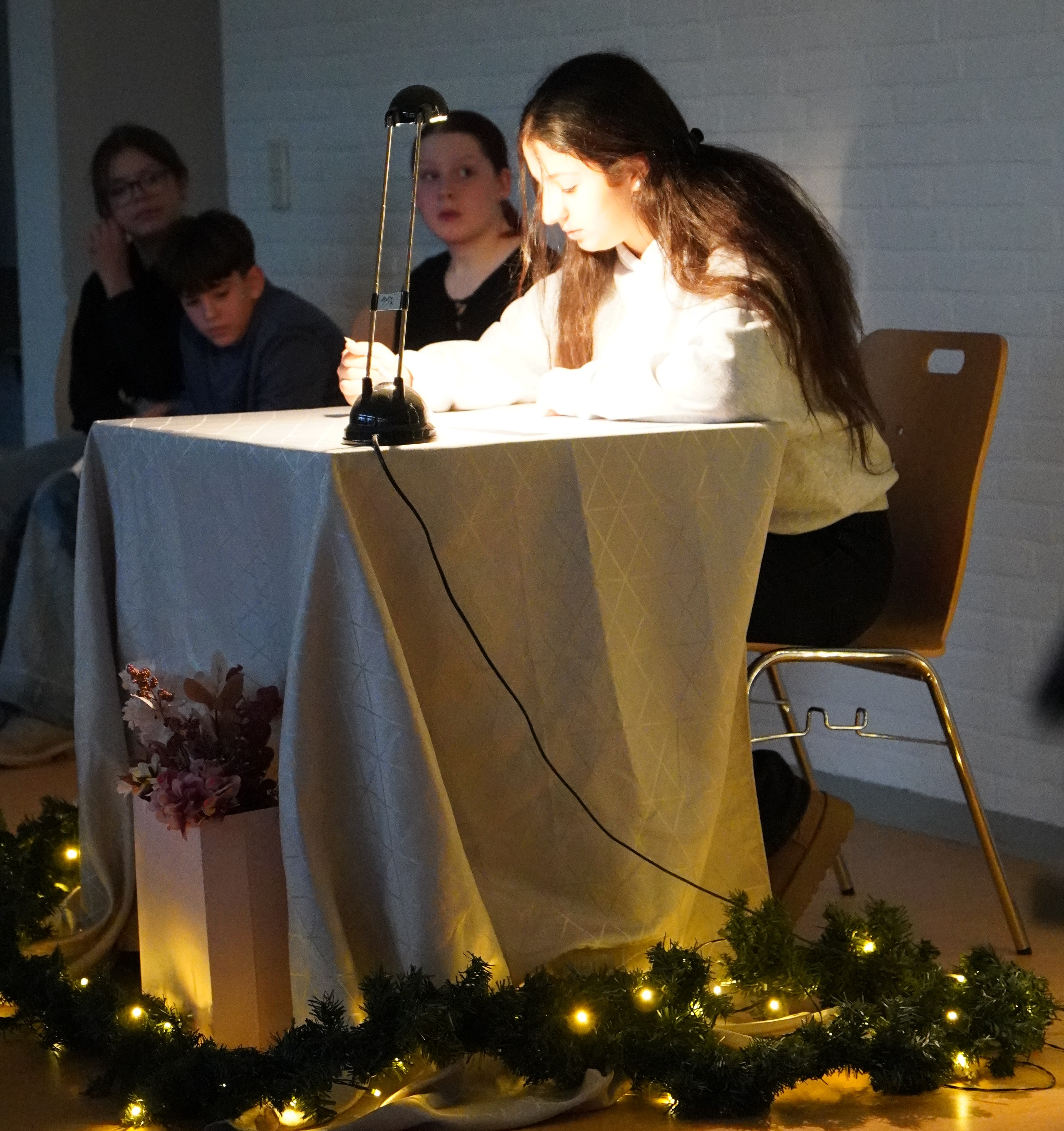 Im zweiten Teil lasen die Schülerinnen und Schüler einen unbekannten Text vor, passend zur vorweihnachtlichen Zeit war es in diesem Jahr eine Geschichte über Rudolph, das Rentier mit der roten Nase. Die fünfköpfige Jury, bestehend aus der Vorjahressiegerin Victoria, Celine aus der Schülervertretung und drei Deutschlehrkräften, bewertete die einzelnen Beiträge. Nach intensiver Beratung war sich die Jury einig: Schulsiegerin des Vorlesewettbewerbs der Schule an den Auewiesen wurde Drita Tatari.