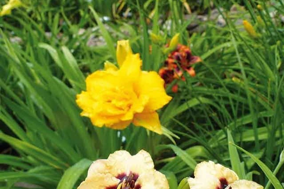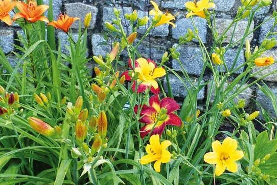 Die Vielfalt der Taglilien ist unglaublich – die Schönen des Tages gibt es von wirklich winzig wie die You Angel You bis zu meterhoch und mit riesigen Blüten, von zartem Cremeweiß bis zu tiefstem Rot, mit den schmalen Spider-Blüten bis zu herrlichen Kelchen, von schlicht und klar bis opulent gerüscht, 480 Sorten hat Gabriele Behrens in ihrem wunderbar angelegten Garten – „diese Vielfalt begeistert mich immer wieder“, sagt sie, „es gibt alle Farben, nur kein strahlendes Weiß und kein Blau.“ Das macht aber gar nichts, denn die übrigen Farben machen das wett von elegantem Weiß-Grün bis zum feurigen Rot-Orange, kaum eine Taglilie ist komplett einfarbig, manche wechseln sogar im Laufe ihrer Blüte die Farbe. Die Beete hat die begeisterte Gärtnerin farblich passend gestaltet – nicht sortiert, weil bunt einfach schön ist, aber die warmen und die kühleren Farben zusammen, harmonisch und ein Genuss fürs Auge und die Seele. Ihre Taglilien säumen in bunter Schönheit die Rasenfläche und den Bachlauf, tauchen hier auf und da und bilden zusammen mit Phlox und Co eine Komposition, wie sie kaum schöner sein könnte.