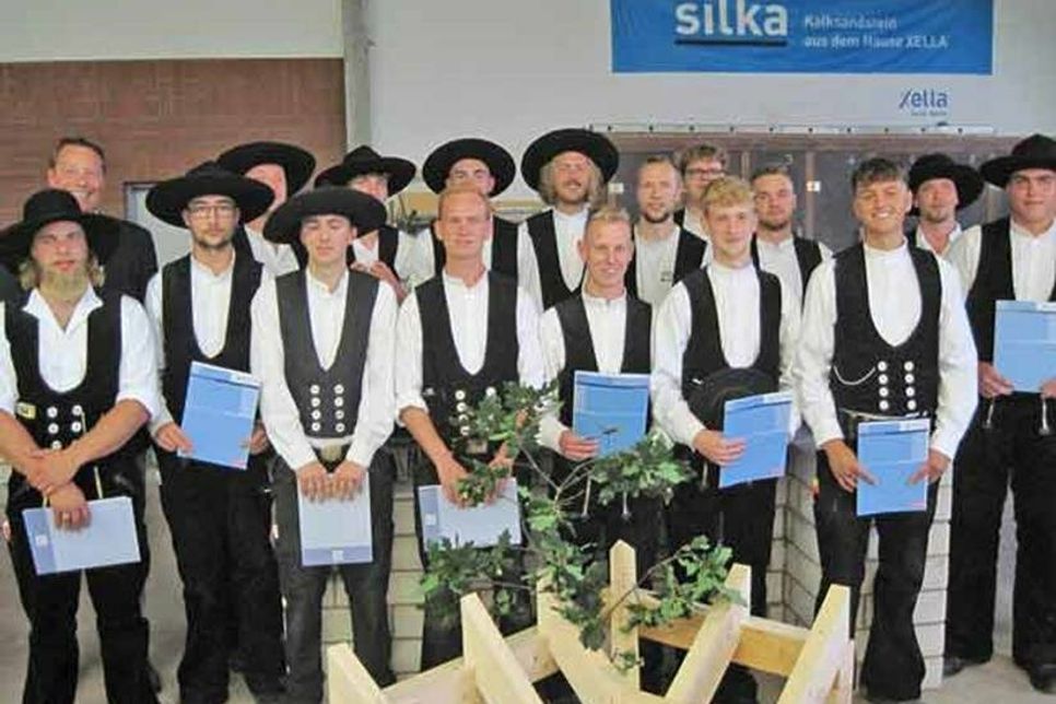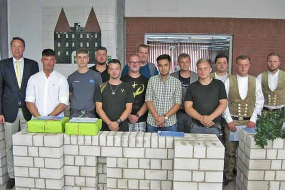 Die Freigesprochenen Junggesellen der Baugewerbe-Innung Ostholstein 2022 im Ausbildungsberuf Maurer: Rico Berg (JKD-Bau Jörg Dahlenburg, Schönwalde), Thies Fiebelkorn (Baugeschäft Jens-Uwe Kühl GmbH, Bad Malente), Toni Frank (Baugeschäft Wieske, Altenkrempe), Mahdi Jafari (Stamer GmbH & Co.KG, Schönwalde), Martin-Georg Klofczynski (K & P Estrichbau GmbH, Groß Meinsdorf), Bjarne-Joris Köhler (Eutiner Bau-Union GmbH & Co.KG, Eutin), Fabian Kommke und Julian Lindner (beide Gollan-Bau GmbH, Schashagen), Fabian Luksch und Leon Mandt (beide Baugeschäft Marc Hofele GmbH, Göhl), Nicolas Meckelmann (Seefeldt Bau GmbH, Fehmarn), Rino Reicht (Eutiner Bau-Union GmbH & Co.KG, Eutin), Marcel Rochel (Baugeschäft Marc Hofele GmbH, Göhl) und Max Jonas Röwe (Gamaler Maurermeister, Timo Affeldt, Gamal).