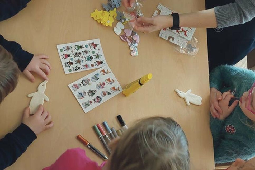 Am 1. Dezember ging dann auch gleich das erste Türchen des Lebendigen Adventskalenders auf, den die Eltern für ihre Lütten in der KiTa gestalten – „auch damit haben wir ein altes Ritual aus der Spielstube mit hierher genommen“, so Christine Erdmann. „Irgendwann haben wir beschlossen, dass die Kinder ohnehin so viel zum Naschen und so viele Geschenke bekommen, dass wir ihnen im Advent lieber jeden Tag etwas Besonderes, Nachhaltiges, Schönes bereiten, an das sie sich erinnern.“ So überlegen sich die Eltern die unterschiedlichsten Aktionen und jeden Tag besucht ein Elternteil die Kinder in der KiTa, bastelt mit mit ihnen Anhänger aus Salzteig als Geschenk für die Eltern, liest eine Weihnachtsgeschichte vor, schreibt mit ihnen einen Brief an den Weihnachtsmann, singt mit ihnen Weihnachtslieder, baut ein Lebkuchenhaus – wer an jedem Tag kommt und was passiert, das verrät der Adventselch. An seinem Geweih hängen die Säckchen für jeden Kindergartentag, und jeden Tag darf ein anderes Kind ein Säckchen öffnen und verkünden, was hinter dem Türchen steckt. So wird die Adventszeit ganz sicher nicht lang und das Warten auf Weihnachten zur spannenden Reise. Und all das auch noch mit einem waschechten Weihnachtswichtel im Haus.