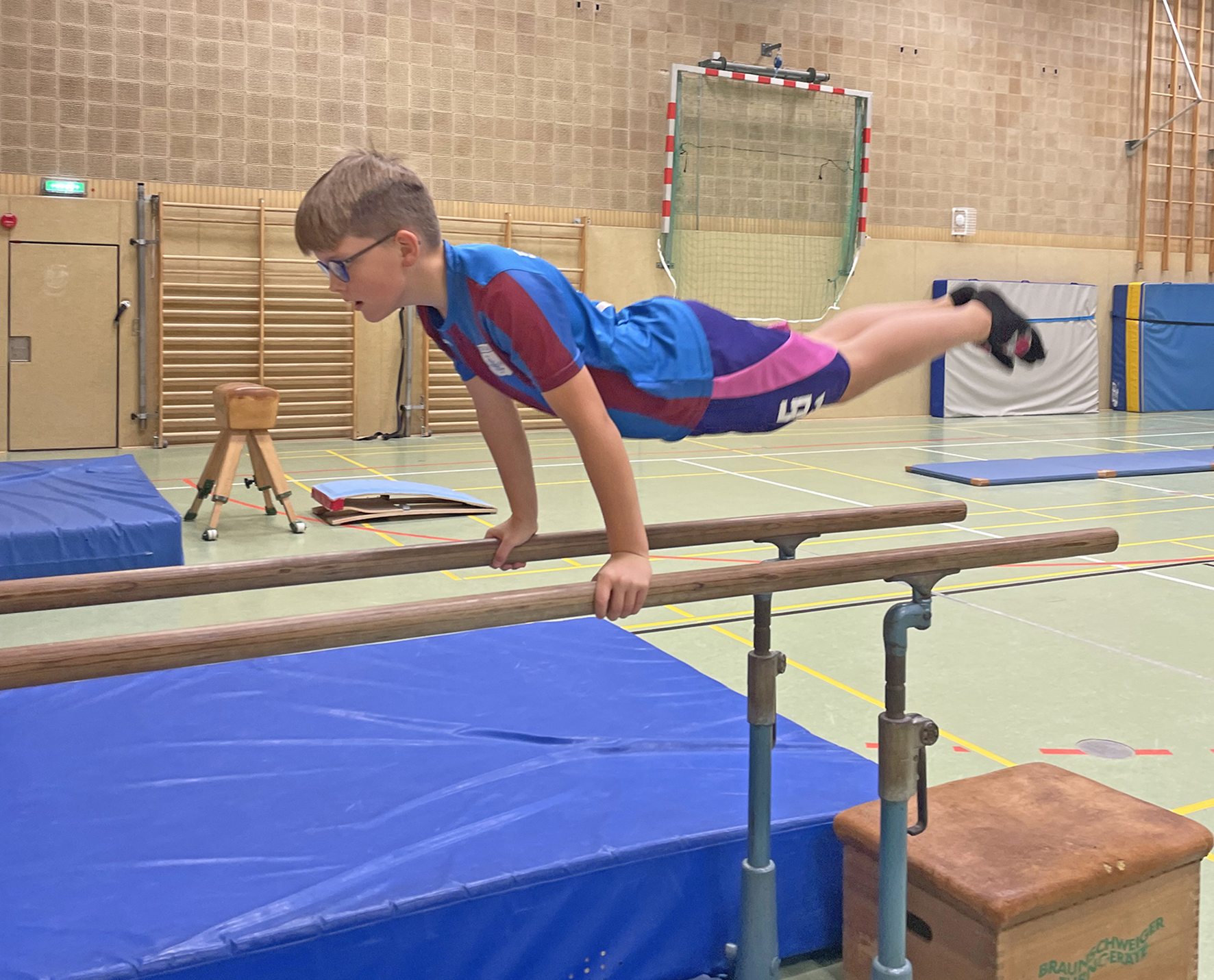 Zu Weihnachtshits konnte jede und jeder zeigen, was in einem steckt. „Die können das ja besser als wir!“, stellte Varvara am Reck fest. Am Tau kletterte Merle ohne Mühe bis nach oben, was ihr schlussendlich auch die nötigen Punkte für den Gesamtsieg vor Henrietta und Madita einbrachte. Am Barren zeigte Matti eine fehlerfreie Übung und sicherte sich so hinter Liam und Leon einen Platz auf dem Treppchen.