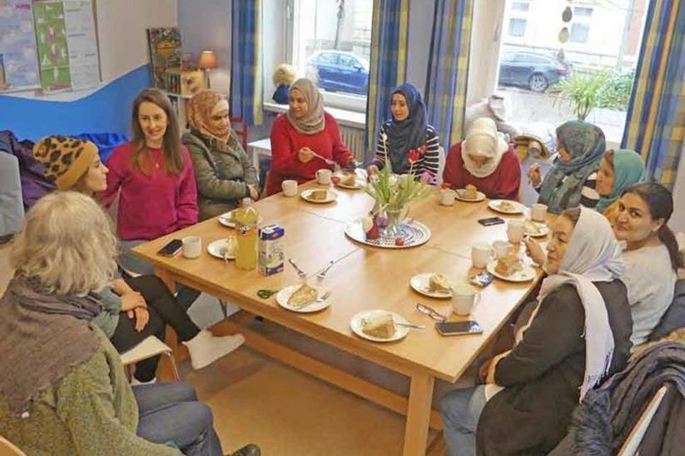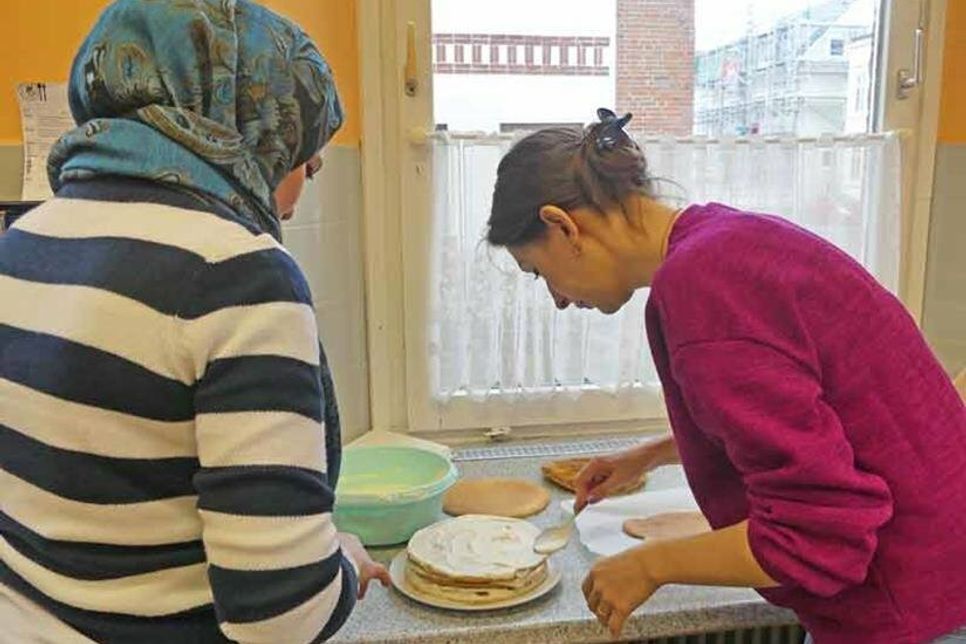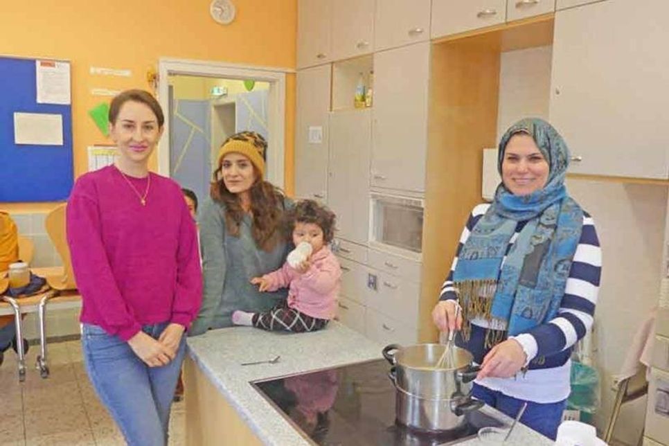 „Was kocht Ihr heute?“ ist eine Frage, die meist zum Ende hin die Runde macht – Erbsensuppe kommt bei Katja auf den Tisch, die essen ihre Kinder am liebsten. Razan macht Pizza für ihre Jungs, Dima Reis mit Fleisch für ihre. Bei Esther gibts Lachsnudeln mit Feldsalat, bei Perwin Kibbe (unglaublich leckere kleine Bulgurkroketten mit Fleischfüllung). Als die Reihe an Amene ist, lacht sie nur und sagt: „Da denke ich später dran, jetzt habe ich noch Urlaub.“ Denn Urlaub vom Alltag, das sind die zwei Stunden immer freitags im Familienzentrum für die meisten – Zeit ganz für sich alleine, Zeit zum Schnacken mit anderen Frauen – „in unserer Heimat machen wir das zwei- dreimal die Woche“, erklärt Dima, „treffen uns mit den Nachbarinnen und Freundinnen, das fehlt hier sehr.“ Deswegen genießen sie den Freitag so, sagen die Frauen, weil sie unter sich sind, keine Verpflichtungen haben, einfach quatschen und lachen können. Und deswegen wird auch mal zwischendrin arabisch gesprochen, aber dann ermahnen Katja oder Amene sie schmunzelnd und sagen „Deutsch bitte!“.