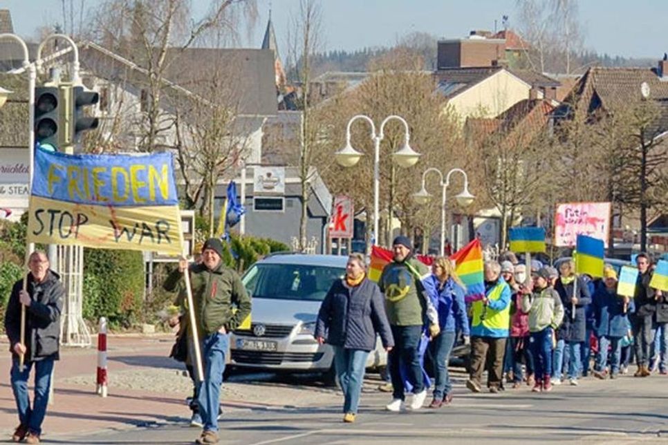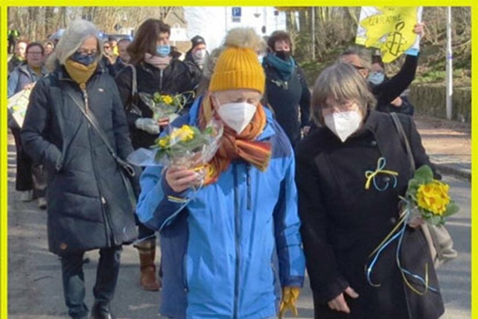 Bad Malente-Gremsmühlen (wh). „Kein Krieg, nirgends“, steht auf einem der Plakate, die am Sonntag bei der Friedensdemonstration für die Ukraine und gegen den „Putin-Krieg“ hochgehalten wurden. Über 150 Teilnehmer zogen durch die Gemeinde, viele in Blau-Gelb, den Farben der Ukraine, gekleidet, eine gelbe Primel in der Hand und ein blau-gelbes Bändchen am Revers. Vom Rathaus ging es zum Bahnhof, von dort über die Lindenallee zur Rosenstraße und von der Kreuzung Janusallee wieder zum Rathaus.