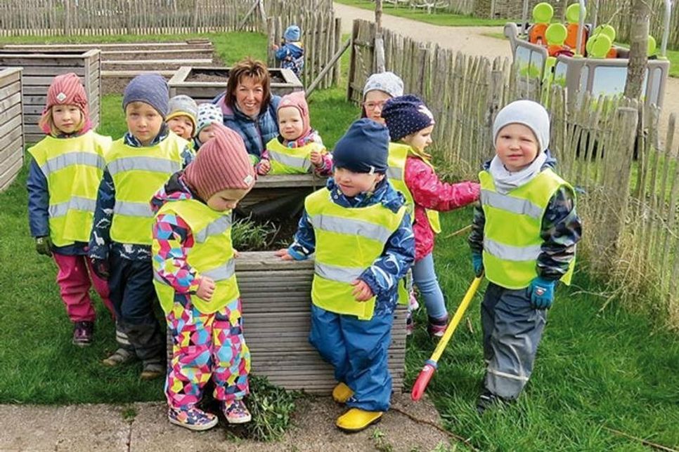 „Es ist so wichtig, dass die Kinder sehen, wie zum Beispiel ein Samenkern allmählich zu einem großen Kürbis wird“, sagt Tina Kramp und streichelt den Kopf der zweijährigen Bella, die ganz stolz eine Harke in die Höhe hebt, mit der sie dann so gut sie kann, Blätter und Erdschollen vom Weg zu fegen versucht. Andere tragen selbst gezupftes Unkraut in eine Schubkarre; dass die Hände dabei schmutzig werden, macht nichts; alle sind eifrig bei der Sache, meist mit konzentriertem, aber fröhlichem Gesichtsausdruck, denn schließlich macht es gerade den Kleinsten den größten Spaß, wenn sie etwas „Richtiges und Wichtiges“ machen können.