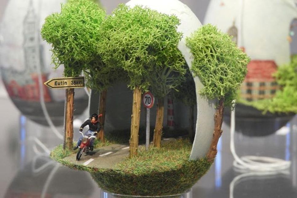 Mit österlicher Dekoration für Galerien und Läden hat auch Edda Henschel begonnen und die Eier zunächst von außen verziert. Irgendwann fing die Künstlerin, die an der Fachhochschule für Gestaltung in Hamburg studiert hat, an, die Schale aufzubrechen: „Schon als Kind habe ich die Bücher gern gemocht, in denen Mäuse in Fliegenpilzen wohnten und in denen Wichtelwelten zu sehen waren“, erinnert sie sich. Längst bearbeitet sie die Hühner- und Gänseeier mit professionellen Werkzeugen, sägt und bohrt Öffnungen und Muster, gewährt Einblicke durch winzige Türen und Fenster. Es ist ein Terrain, das sie sich selbst erobert hat und auf dem sie allein wirkt - mit Dioramen in Eiern beschäftigt sich soweit bekannt, niemand sonst auf diesem Niveau. Für Edda Henschel ist es die erste Museumsausstellung. Inspiration für ihre Miniaturwerke findet sie überall: „Zur Sicherheit notiere ich nächtliche Einfälle“, verrät sie. Auch die gestalterischen Mittel können ihr zu jeder Zeit und bei allen Gelegenheiten begegnen: Paprikasamen machen sich gut als Fladenbrote auf der Tafel des Sultans, Teile von Zitronennetzen werden golden gefärbt zu Fenstergittern, auf Spaziergängen werden Hölzer und Schneckenhäuser gesammelt. Im Fachhandel für Modellbau gibt es Figuren wie den Motorradfahrer, den Edda Henschel mit Tempo 70 Richtung Eutin schickt. Und Uhu-Klebstoff verbraucht sie in rauen Mengen. In jedem einzelnen Ei ist eine Fülle von Details zu entdecken, die sich Geschichten verweben und staunen machen: „Kinder haben erfahrungsgemäß besonders viel Geduld beim Schauen“, hat die Kreative beobachtet. Für die junge Besucherschar hat sie dann auch eine kleine Rallye vorbereitet, in der zehn Fragen zu den Eier-Szenarien gestellt werden. An diejenigen, deren Augen nicht mehr so scharf sind, wendet sich ein Angebot der Fielmann-Filiale, die Lesebrillen und Lupen zur Verfügung stellt, damit keine Aufschrift, keine Winzigkeit den Blicken entgeht. Mitbringen sollte man Muße, denn es ist eine Ausstellung, für die man sich Zeit nehmen muss. Wer sich darauf einlässt, dem sind ungewohnte Dimensionen versprochen und der Zugang zu einer fantasievollen Welt - der Welt im Ei eben.