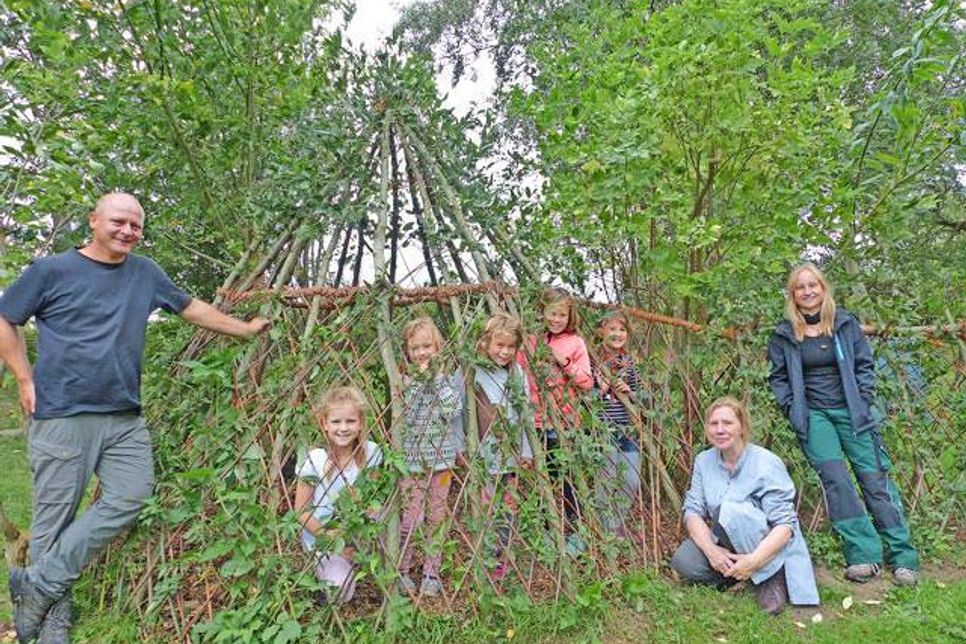 Fissau (ed). Auf dem oberen Teil der Spielwiese hinter dem Montessori-Kinderhaus in Fissau gleich links neben dem großen, alten Walnussbaum wächst und gedeiht seit dem Frühling ein Tipi, das für die Kinder der Fissauer KiTa ein Ort zum Spielen, Verstecken oder Ruhefinden geworden ist. Über den trockenen Sommer hinweg haben die Kinder und ErzieherInnen fleißig gegossen, damit das Tipi ordentlich Wurzeln ausbildet und ein schattiges Blätterdach bekommt – denn das Indianerzelt ist aus Weidenästen und -zweigen gebaut und fügt sich so perfekt in das schöne, eingewachsene Grundstück des Kinderhauses. „Spendiert“ hat es die Integrierte Station Holsteinische Schweiz, Außenstelle des Landesamtes für Landwirtschaft, Umwelt und ländliche Räume.