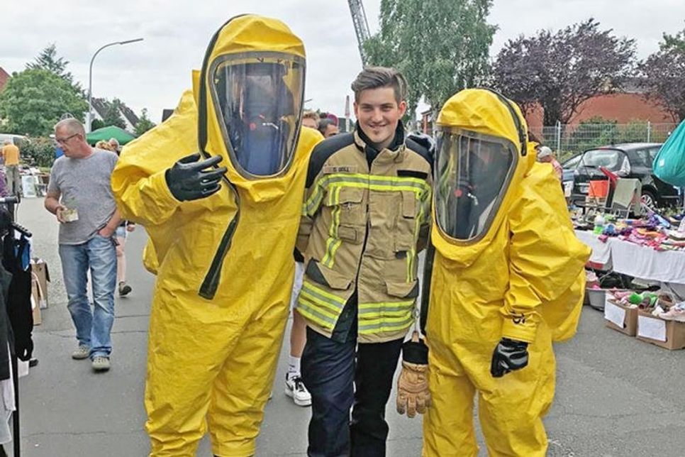 Plötzlich tauchen in der Menschenmenge zwei große knallgelbe „Figuren“ auf. Dominic Petz und Maja Hirner von der Freiwilligen Feuerwehr tragen spezielle Chemikalienschutzanzüge, die zum Beispiel bei Unfällen mit Gefahrengütern zum Einsatz kommen. Dennis Doll begleitet die beiden, die man durch die schweren Anzüge kaum verstehen kann, und klärt die Besucher auf dem Fest darüber auf.