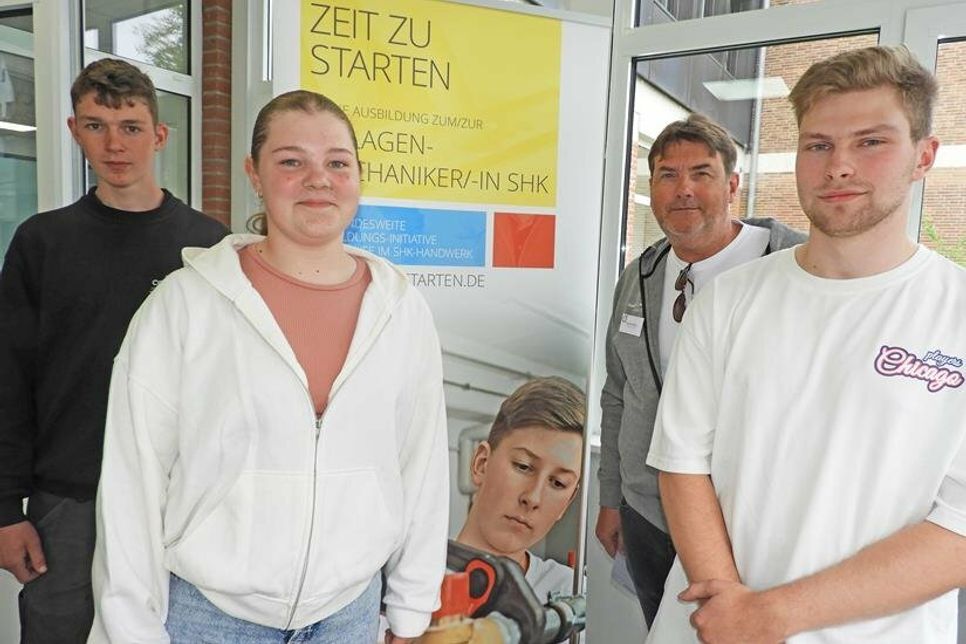 Eutin (aj). Die Zukunft hat ein Gesicht. Besser gesagt: Sie lacht aus den Gesichtern der 15 Auszubildenden, die der Einladung zur festlichen Einschreibefeier in die Berufliche Schule des Kreises Ostholstein am Standort Eutin gefolgt waren. Hier, wo der theoretische Teil ihrer Ausbildung stattfinden wird, hatten die junge Berufsstarter Gelegenheit, nicht nur die Unterrichtsräume zu besichtigen. Es war auch das herzliche Willkomm der Ausbildungsbetriebe, die sich über jede angehende Fachkraft freuen: “Dieser würdige Rahmen ist auch Werbung für unser Handwerk”, unterstrich Holmer Hahn, Obermeister der Innung. Wie seine Berufskollegen steht er persönlich für die Vielfalt und die Aufstiegschancen, die der Bereich Sanitär-, Heizungs- und Klimatechnik eröffnet. Denn unverändert kann das Handwerk viel in die Waagschale werfen, wenn es um ein sinnerfülltes und erfüllendes Berufsleben geht. Wer statt Büroluft zu schnuppern lieber unterwegs ist und die Abwechslung liebt, kann hier richtig sein. Levin Möller jedenfalls hat sich so entschieden: “Ein Bürojob kam für mich nicht in Frage”, sagt der junge Mann, der nach dem ESA ein Praktikum bei Cobobes in Eutin absolvierte und sich dort gleich wohlfühlte. Ähnlich hat es auch Chris Hundertmark erlebt: “Nach dem Mittleren Schulabschluss an der Wisserschule stand für mich fest, dass ich ein Handwerk lernen möchte.” Auch ihn bestätigte ein Praktikum bei Cobobes in seinem Entschluss. Neben den interessanten Tätigkeiten sei es das Team gewesen, das sie angesprochen habe. Auf der Einschreibefeier gewannen sie. nicht einen Eindruck von der Bandbreite ihrer Ausbildung. Sie warfen auch einen Blick in die Zukunft. Denn im Buderus-Truck, der eigens eingeladen worden war, stand mit der Innen- und Außeneinheit einer Wärmepumpe ein Anschauungsobjekt bereit, das den Berufsalltag des Nachwuchses prägen dürfte: “Da geht die Zukunft hin”, unterstrichen Heiko Kersten und André Jaschinski vom Buderus Innendienst Kiel. In dreieinhalb Jahren werden die Fachkräfte wie Jönne Lenschau wissen, wie man eine solche Anlage installiert und wartet. Der Berufscoach brachte die junge Frau auf die Idee, sich im Handwerk umzusehen. Auch hier gab das entsprechende Praktikum den letzten Anstoß. Wie es nun weitergeht, erfuhren nicht nur die jungen Leute selbst: “Es ist cool, dass hier auch die Eltern einen Einblick bekommen und man nicht nur zu Hause davon erzählt”, meinte Chris Hundertmark, ehe er mit seiner Gruppe den Schul-Rundgang begann.