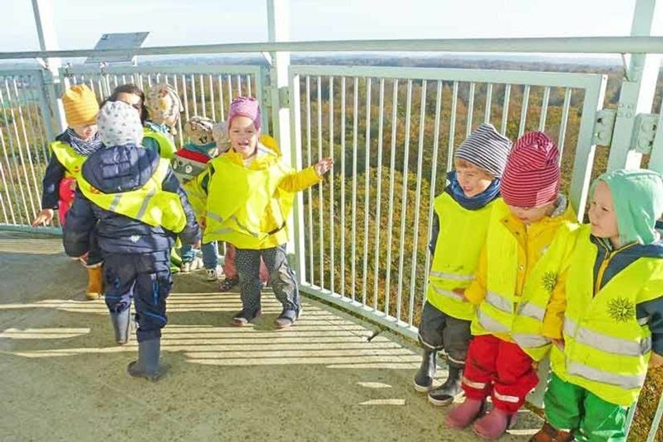 Dort erfahren sie eine ganze Menge erstaunlicher Dinge über das Leben der putzigen Nagetiere. „Der Biber putzt sich immer und fettet sein Fell dabei ein, darum friert er auch nicht“, staunt eines der Kinder. „Es kommt nämlich kein Wasser an sein Fell.“ Und:„Er hat ganz gelbe starke Zähne, damit kann er sogar Bäume fällen.“ Die Zähne sind zwar gelb, aber super stark, das finden die Kinder cool: „Er isst nur Weidenstöcke und hat ja auch keine Zahnbürste.“ „Er muss tauchen, um unter Wasser in seine Höhle zu kommen. Da bringt er auch das Essen für seine Kinder rein“, haben sie sich prima gemerkt. Und: „Der Biber lebt nur in fließenden Gewässern und bei Gefahr planscht er laut mit seiner Kelle, so heißt sein Schwanz, auf das Wasser und warnt so die anderen Biber“. Was man lernt, muss man natürlich auch ausprobieren, das geht auf dem Bungsberg besonders gut – also machen die Kinder sich dran, gleich mal ein paar Biberdämme zu bauen. Und weil man von oben am allerbesten sehen kann, erklimmen die Kinder den Elisabethturm, den höchsten Punkt von ganz Schleswig-Holstein – aber auch mit ihren Adleraugen und von ganz oben ist weit und breit kein Biber zu sehen.