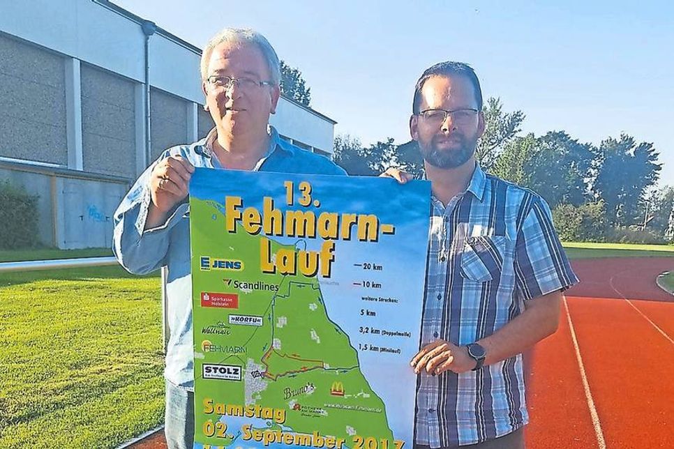 Fehmarn. Nachdem der Fehmarnlauf im letzten Jahr nicht stattfinden konnte, freuen sich die Organisatoren um Ralph Schwennen (l.) und Stefan Schäfer nun auf einen neuen Anlauf in 2017. Mit neuen Strecken und neuer Streckenführung, die nun nicht mehr durch Burg führt, sondern Richtung Gahlendorf und aktuell über 150 Anmeldungen ist man gut aufgestellt. Neben dem Minilauf und der Doppelmeile kann man am 5km, 10km sowie 20km Lauf teilnehmen. Auch für Kurzentschlossene ist eine Anmeldung bis eine Stunde vor dem jeweiligen Lauf noch möglich. Durch die Kooperation mit Fehmarns Schulen ist eine Teilnahme für alle Schüler kostenlos. Möglich gemacht haben den Fehmarnlauf 2017 zahlreiche Sponsoren wie Edeka Jens, Scandlines, Sparkasse Holstein, Korfu, Strandcamping Wallnau, TSF, Kaufhaus Stolz, McDonald´s, Bruno´s Getränkemarkt, Apotheke am Markt sowie www.webcam-fehmarn.de. Alle notwendigen Informationen finden Interessierte auch unter www.svfehmarn.de/fehmarnlauf. Die Ausgabe der Startnummern ist am kommenden Samstag ab 13 Uhr, Beginn des ersten Laufs (1,5km) ist um 14.30 Uhr. Die Veranstalter freuen sich auf viele Laufbegeisterte!