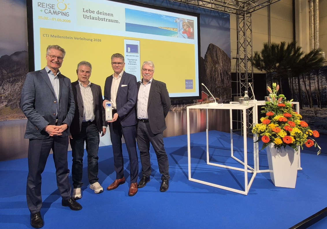 Das kürzlich erarbeitete nachhaltige Tourismusentwicklungskonzept der Insel Fehmarn verbindet touristische Nutzung mit Naturschutz. Für den Einklang von Natur und Tourismus wurde der Tourismus-Service Fehmarn jetzt auf der Reise Camping Messe 2026 in Essen mit dem „Meilenstein 2026“ der Vereinigung der Caravaning- und Touristik-Journalisten (CTJ e.V.) ausgezeichnet. „Wir freuen uns sehr über die Auszeichnung, die uns zeigt, dass Fehmarn mit seiner Entwicklung in Richtung Nachhaltigkeit den richtigen Weg einschlägt“, so Tourismusdirektor Oliver Behncke.