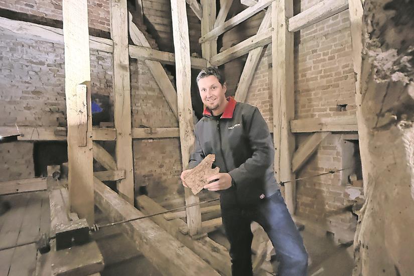Pastor Friedemann Holmer führt uns auf den Turm, um die Schäden aus nächster Nähe zu betrachten. Über eine schmale Steintreppe gelangt man zunächst ins Gewölbe über dem Kirchenschiff. Schon dort fallen deutliche Spuren der Zeit ins Auge: poröse Schwellen, vergammelte Balken, herausgerutschte Lastbalken sowie gekippte oder verbogene Tragebalken, zum Teil mehr als 600 Jahre alt.