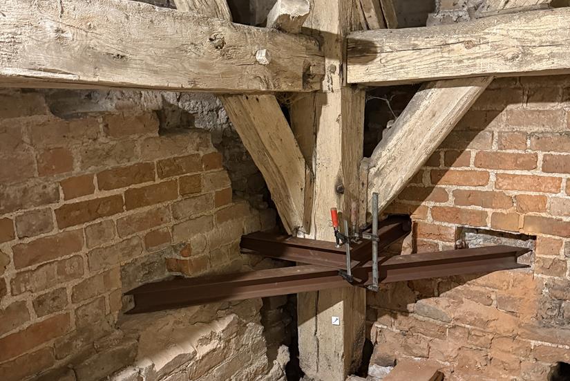 „Das hier kann man nicht einfach ersetzen, sondern nur stabilisieren“, erklärt Pastor Holmer und richtet die Baulampe auf die verzogene Dachkonstruktion. Über zahlreiche ungleich hohe Holzstufen und eine steile Leiter geht es weiter hinauf in den Bereich, der im ersten Bauabschnitt im Mittelpunkt steht: der Turm. Dort zeigt sich das Tragwerk in besonders kritischem Zustand. Manche Balken wurden bereits vor Jahrhunderten gekappt, andere sind so stark porös, dass sie kaum noch Last aufnehmen können. Einige tragen sogar nur noch zehn Prozent ihrer ursprünglichen Tragkraft.