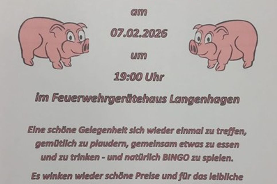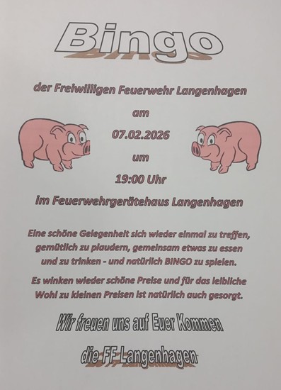 Langenhagen. Die Freiwillige Feuerwehr Langenhagen lädt zum Bingospielen am Samstag, dem 7. Februar um 19 Uhr im Feuerwehrgerätehaus ein. Es wird um Gewinne gespielt. Für das leibliche Wohl zu kleinen Preisen ist gesorgt. (red)
