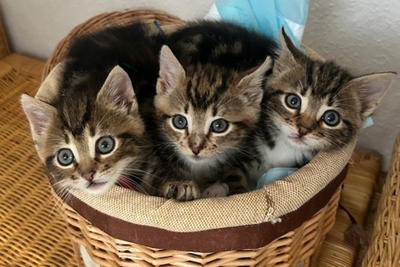 Oldenburg in Holstein. Der Verein Katzenklappe Notfallkatzen / Streunerhilfe Oldenburg stellt vor: Die drei kleinen Tiger - Skadi, ihr Bruder Scoll und Skip - hatten keinen einfachen Start ins Leben. Die fünfköpfige Katzenfamilie wurde auf einem Hof entdeckt, doch leider waren zwei Geschwisterchen bereits tot. Die drei Überlebenden kamen völlig entkräftet und ausgehungert zum Verein - kaum 200 Gramm schwer und dringend auf Hilfe angewiesen. Mit viel Liebe, Wärme und der Milchflasche wurden sie großgezogen. Heute sind sie putzmunter, neugierig und verspielt, erkunden gemeinsam ihre kleine Welt und geben sich gegenseitig Halt und Geborgenheit. Sie toben, kuscheln und schnurren um die Wette - und haben das Herz ihrer Pflegemama längst im Sturm erobert. Die drei sind menschenbezogen, verschmust und anhänglich, genießen Streicheleinheiten und suchen Nähe und Zuwendung. Ihre hübsche Tigermusterung macht sie zudem zu echten kleinen Hinguckern.