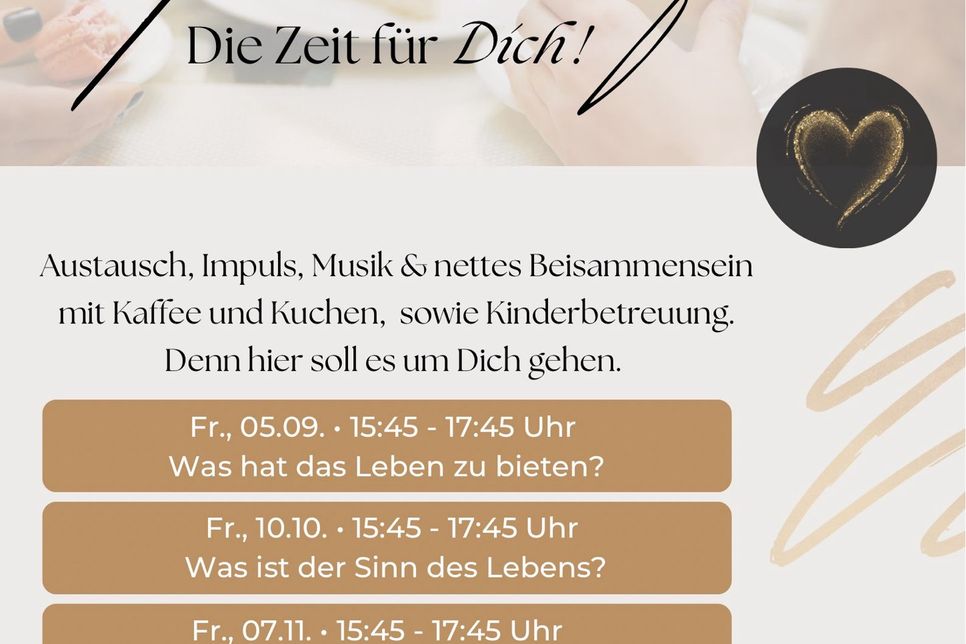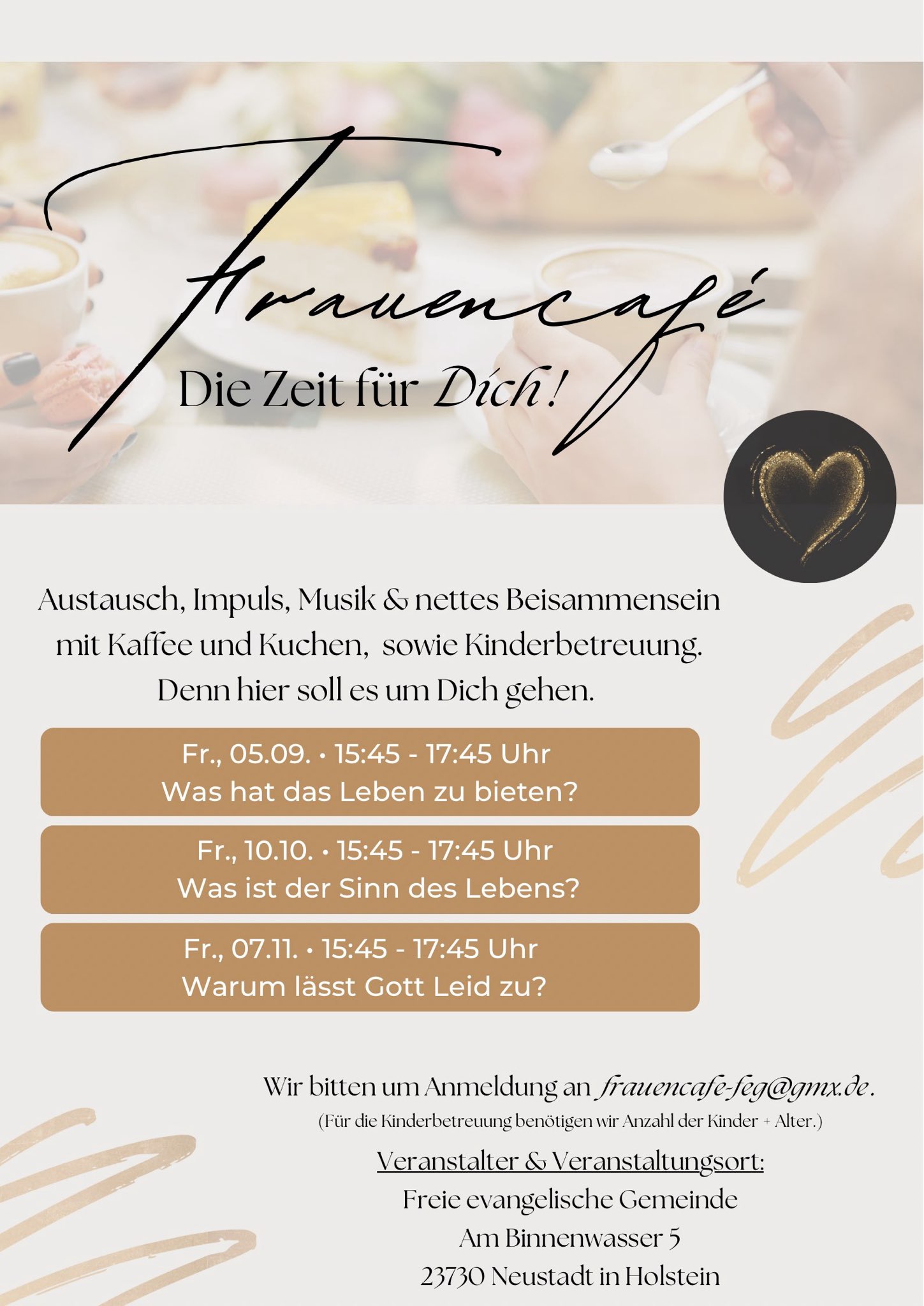 Neustadt in Holstein. Am Freitag, dem 5. September lädt die Freie evangelische Gemeinde von 15.45 bis 17.45 Uhr zum Themennachmittag im Rahmen des Frauencafés ein. Dieses Mal steht das Thema „Was hat das Leben zu bieten?“ im Mittelpunkt. In gemütlicher Atmosphäre mit Kaffee, Kuchen und musikalischem Rahmen geht es um Austausch, Impulse und Gespräche rund um die Schätze christlicher Spiritualität. Auch Kinderbetreuung wird angeboten. Veranstaltungsort ist die Freie evangelische Gemeinde, Am Binnenwasser 5. Eine Anmeldung ist per E-Mail an frauencafe-feg@gmx.de erforderlich. Für die Kinderbetreuung wird um Angabe von Anzahl und Alter der Kinder gebeten. (red)