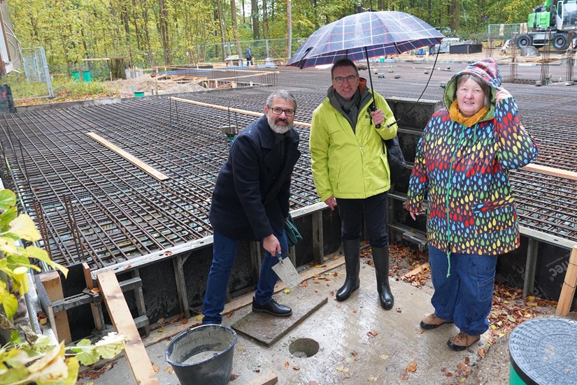Doch jetzt steht dem Neu- und Umbau nichts mehr im Weg, nicht zuletzt wegen einer Spende in Höhe von 2,3 Millionen Euro über die GLS Treuhand sowie einer Umplanung und Reduktion der Gebäudequalität. Damit wurde die „Kostenbrücke“, wie Ulbrich es nannte, erfolgreich geschlossen und die Umsetzung kann endlich beginnen. Der Baufortschritt ist bereits sichtbar: Die Schalung steht und in den nächsten Tagen werden hier 350 Kubikmeter CO2 induzierter Beton hineingegeben, die das Fundament des großzügigen Anbaus bilden. Anschließend folgen die Hochbauarbeiten, für die unter anderem 250 Kubikmeter zertifiziertes Nadelholz verbaut werden. Zusammen mit dem sanierten Bestandsgebäude entsteht so Platz für zwei Schulklassen, Betreuungskräfte, eine Küche und Ausstellungsräume nach nachhaltigen Standards.