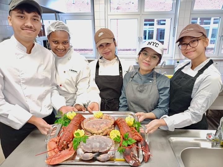 Als der erste Vorsitzende, Frank Berger vom Restaurant Brechtmann in Scharbeutz-Schürsdorf am Dienstagmorgen mit Kisten voller Luxusgüter in die Berufliche Schule kam, war die Freude groß. Die Auszubildenden recherchierten die wichtigsten Zubereitungsarten und bekanntesten Rezepte für Hummer und Taschenkrebs. Die Krustentiere wurden fachmännisch zubereitet und anschließend verkostet. Es wurden die Zubereitungsarten „Thermidor“ und „Amerikanische Art“ vorgestellt und mit den modernen Varianten aus den einzelnen Betrieben verglichen. Das Aufbrechen der Krusten eines Hummers oder auch der Krebszangen stellte für einige Auszubildende eine ganz neue Herausforderung dar.