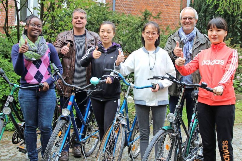 Eines der Angebote ist die Integrationswerkstatt, in der Kinder, Jugendliche und Erwachsene aller Nationalitäten in ihrer Freizeit gemeinsam gebrauchte Fahrräder reparieren. Als Heino Esmann (Leiter, Ameos Institut Nord) davon hörte, fragte er beim Verein an, ob dieser für vier internationale Schülerinnen – drei Chinesinnen und eine Kamerunerin – Fahrräder zur Verfügung stellen würden. Die jungen Frauen haben im April eine Ausbildung zur Gesundheits- und Krankenpflegerin am Ameos Institut Nord begonnen. Der Verein war sofort dazu bereit zu unterstützen. Schnell war ein Termin für die Übergabe gefunden und die Freude bei der Übergabe war riesengroß „Unsere Schüler aus Kamerun und China arbeiten mit viel Fleiß, hohem Engagement und sehr großem Interesse in den Pflegeausbildungen. Die Mitarbeiter des Instituts fördern nicht nur die berufliche Integration – auch die gesellschaftliche Integration wird unterstützt.“ Die Kontaktherstellung zu Sportvereinen aber auch der Besitz eines Fahrrades spielen hier eine wichtige Rolle; schon bald wollen die Vier auf gemeinsamen Radtouren mit ihren Mitschülern die Stadt und den nahen Strand erkunden und bei den Ausflügen ihre Sprachkenntnisse weiter verbessern. Das sichere Fahren muss allerdings noch ein wenig geübt werden… (red)