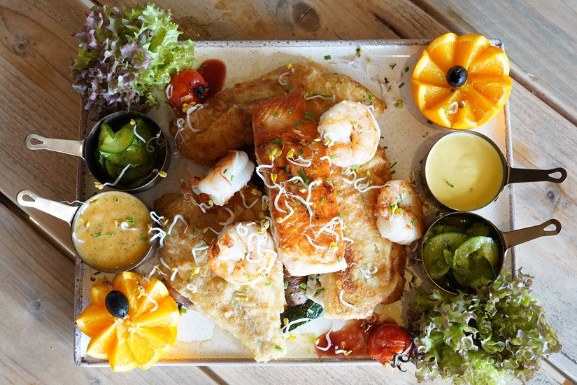 Was bereits beim Betreten des Restaurants auffällt, ist die gute Laune und herzliche Stimmung, mit der die Gäste empfangen werden. Es wird klar, wer hier herkommt, soll sich rundum wohlfühlen. Zubereitet werden typisch schleswig-holsteinische Gerichte (mit dem Schwerpunkt auf Fisch), wie Holsteiner Matjesfilet, Scholle nach Finkenwerder Art oder Dorsch in Senfsoße, alles aus saisonalen und regionalen Zutaten. Auch Roastbeef, Kalbsleber, herzhafte Suppen und knackige Salate stehen auf der Speisekarte. Für Strandbesucher und Spaziergänger gibt es Getränke in Dosen und Fischbrötchen zum Mitnehmen und auch Klassiker wie Currywurst-Pommes oder Fish and Chips sind bei „Fisch & Meer“ zu haben. Wer auf ein Heißgetränk während seines Spaziergangs einkehren möchte, kann Cappuccino, Latte Macchiato, Espresso und Co. zu einem Stück Torte oder Kuchen genießen. Für Teetrinker stehen Spezialitäten aus dem Lübecker Teekontor bereit.