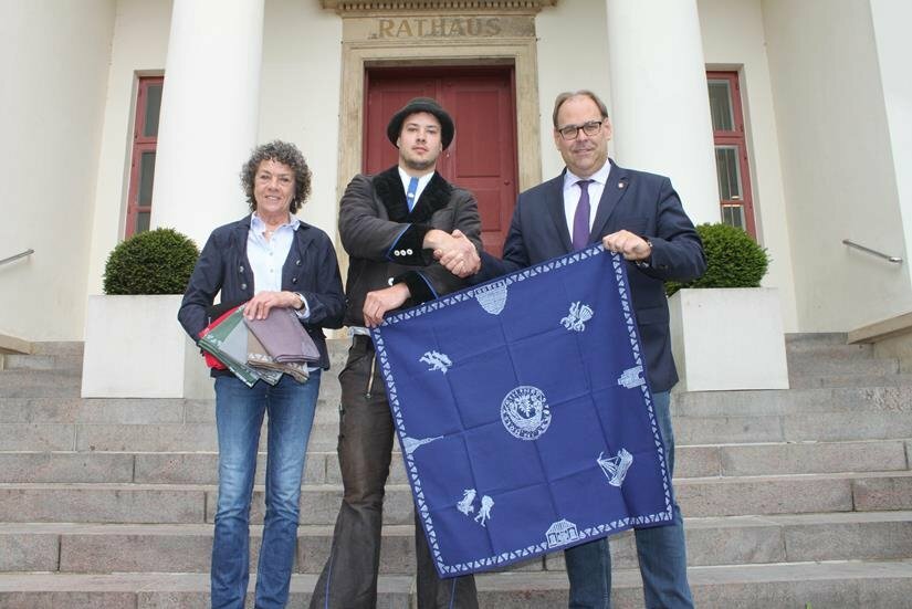 Die handwerkliche Herstellung der Tücher im traditionellen Blaudruckverfahren mit dem Stadtwappen in der Mitte war Felix Lambeck besonders wichtig, um die Hochwertigkeit des Produktes sicherzustellen. Den ersten „Charlie“ (in blauer Farbe) bekam der Ideengeber vom Bürgermeister am vergangenen Dienstag im Rathaus geschenkt: „Wir bedanken uns bei Felix als Ideengeber, bei seiner Mutter Ulrike für die Umsetzung und bei den zahlreichen Sponsoren für die Unterstützung und freuen uns, künftig den Wandergesellen dieses hochwertige Tuch überreichen zu können“, so Spieckermann. (ab/red)