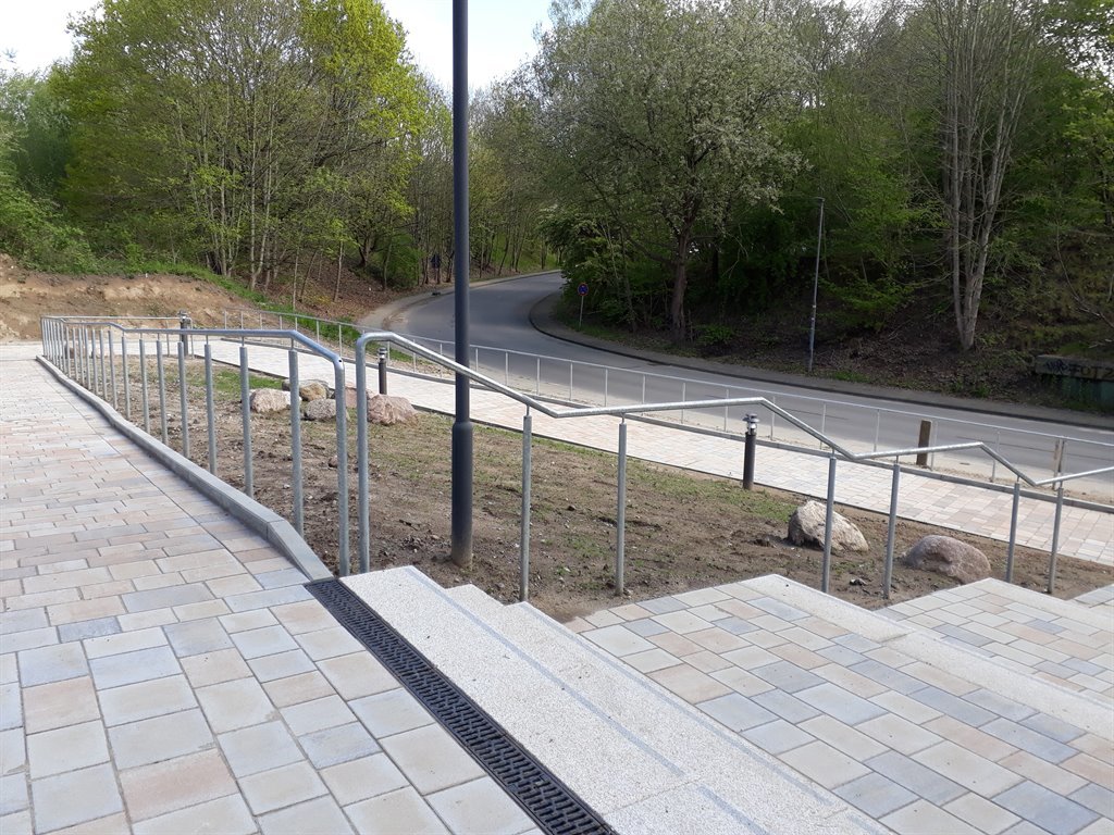 Handläufen; Pflasterung der Zwischenpodeste identisch zur Pflasterung auf der Promenade zur Schaffung einer visuellen Zusammengehörigkeit; „Nothaltebuchten“ an den Gefällen zum Verweilen; Findlingsmauern als Sitzgelegenheit; Schaffung von Aufenthaltsräumen am vorhandenen Teich; teilweise Aufweitung des Gehweges.