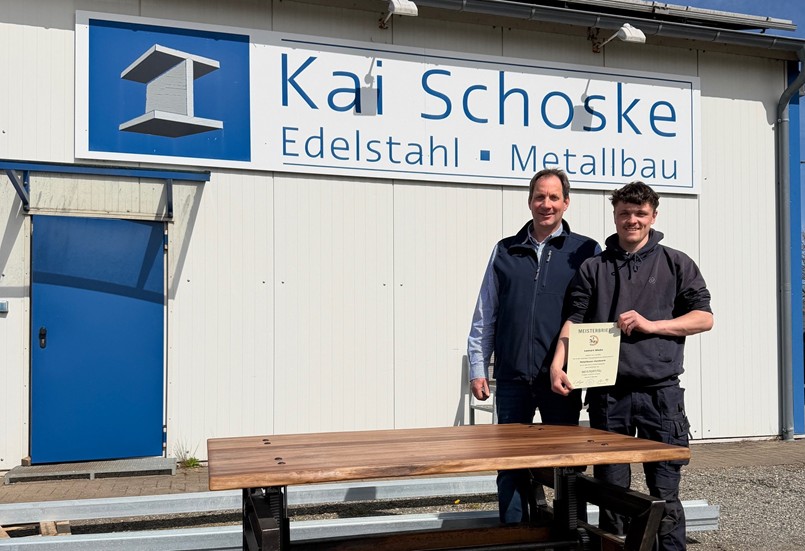 Schon während dieser Zeit überzeugte Wiebe mit herausragenden Leistungen: 2024 wurde er sowohl Innungsbester als auch Landessieger und qualifizierte sich für den Bundeswettkampf. Direkt im Anschluss setzte er seinen Weg konsequent fort und besuchte berufsbegleitend von Oktober 2024 bis März 2026 die Meisterschule in Schwerin – mit Erfolg: Er erlangte den Meistertitel im Metallbauerhandwerk.