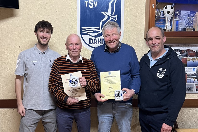 Für langjährige Treue zum Verein gab es besondere Ehrungen: Hans-Jörg Jörgensen wurde für 50 Jahre Mitgliedschaft zum Ehrenmitglied ernannt, Axel Kramer für 60 Jahre geehrt. Die silberne Vereinsnadel für 20 Jahre Mitgliedschaft erhielten Benjamin Speer, Stephan Bier und Cosima Lafrentz.