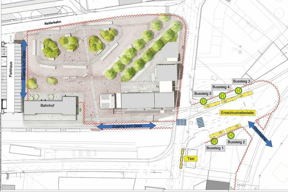 In dem Bereich zwischen Parkhaus, Bahnhof, Reiferbahn und Bahnhofsstraße werden verschiedene Maßnahmen durchgeführt, wie der Rückbau der vorhandenen Oberflächen, der Bau der Businsel mit sechs umlaufenden Bussteigen, der Bau von sechs Wartehallen, die Montage eines digitalen Fahrgast-Informationssystems, die Herstellung von Pflanzinseln sowie der Bau eines Fahrradparkhauses. Die Fertigstellung der Baumaßnahme ist für den Frühherbst 2024 geplant.