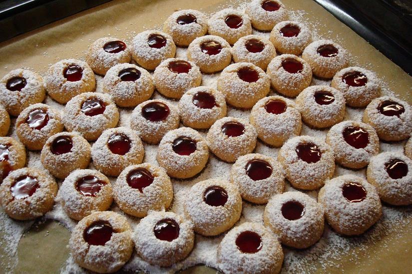 Für den Teig als erstes Mehl, kalte Butter, Puderzucker, Vanillezucker und eine Prise Salz zu einem glatten Teig verkneten. Den Teig zu einer Kugel formen, in Frischhaltefolie einwickeln und für mindestens 30 Minuten im Kühlschrank ruhen lassen. Danach den Ofen auf 180 Grad Celsius vorheizen. Den Teig dann auf einer leicht bemehlten Fläche circa drei Millimeter dick ausrollen. Daraus Kreise ausstechen und die Hälfte der Kreise in der Mitte mit einem kleineren Ausstecher oder einem scharfen Messer ein Loch ausstechen. Diese werden die Oberseiten der Plätzchen. Alle Plätzchen dann auf ein mit Backpapier ausgelegtes Blech legen. Die Plätzchen im vorgeheizten Ofen etwa zehn bis zwölf Minuten backen, bis sie leicht goldbraun sind. Die Plätzchen abkühlen lassen. Die Plätzchen mit dem Loch mit Puderzucker bestäuben. Die Plätzchen ohne Loch mit Johannisbeergelee oder Himbeermarmelade bestreichen und die mit dem Loch daraufsetzen. Die Engelsaugen zum Schluss vollständig abkühlen lassen, damit die Marmelade fest wird. Viel Spaß beim Nachbacken! (red)