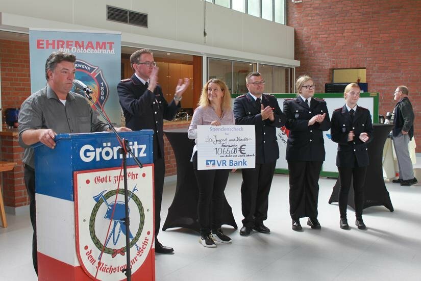 Weiterer Höhepunkt beim Festkommers war die Übergabe einer Spende in Höhe von 1.065 Euro durch André und Dana Scheel vom Restaurant Friesenstube an die Kinder- und Jugendfeuerwehr. Statt Blumen hatten die beiden zu ihrer Silberhochzeit für die Golfjugend und die Feuerwehr gesammelt. (ab)