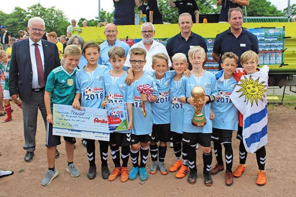 Oldenburg. (ss) Am letzten Samstag, 09.06.2018, fand kurz vor der offiziellen Fußball -WM in 10 Standorten in Norddeutschland, so auch in Oldenburg, die famila- Mini-WM statt. Der Oldenburger SV hat diese in Zusammenarbeit mit dem famila-Warenhaus in Oldenburg, vertreten durch den Warenhausleiter Stefan Bettin und mit Unterstützung durch den Neustädter Warenhausleiter Sven Rasmussen, organisiert und einen tollen Tag für alle Spieler und Besucher vorbereitet. 32 begeisterte E-Jugend-Teams kickten hier um den Pokal. Ein Höhepunkt war bereits das Einlaufen der einzelnen Teams zu Beginn des Turniers. Alle Mannschaften wurden von famila mit einer Tracht in den jeweiligen Landesfarben ausgestattet, die jeder Spieler am Ende auch behalten durfte. Bei bestem Wetter zeigten die Nachwuchsspieler ihr Können, waren mit viel Ehrgeiz dabei und zeigten schon tollen Fußball. Gespielt wurde auf vier Feldern nach dem Original-Spielplan der kommenden WM in Russland. Hier wurden jedoch alle Plätze ausgespielt, damit alle viele Spielanteile haben. Während des Turniers herrschte eine tolle Stimmung auf der gesamten Sportanlage. Es gab viele spannende Spiele zu sehen, teilweise mussten die Teams sogar ins Entscheidungsschießen gehen. Im kleinen Finale spielte dann England (SC Cismar) gegen Schweden (Eutin 08) und gewann hier mit 2:0 und konnte sich über den 3. Platz freuen. Im Finale standen sich Portugal (Oldenburger SV 1) und Uruguay (Gadeland Neumünster) gegenüber, wobei sich am Ende Uruguay mit 1:0 durchsetzte und Mini-Weltmeister wurde. Ob sich diese Konstellationen auch bei der richtigen WM ergeben, bleibt abzuwarten. Vor der Siegerehrung wurden, ebenfalls von famila gesponsert, unter allen teilnehmenden Spielern 4 Saisonkarten für den Heidepark, 4 Musical-Karten für Aladin und 1 mal Eintritt für 4 Personen in den Heidepark inkl. Hotelübernachtung mit Frühstück verlost. Zur Siegerehrung war sogar der Präsident des Schleswig-Holsteinischen Fußballverbandes und Vizepräsident des DFB Hans-Ludwig Meyer angereist. Auch Oldenburgs Bürgermeister Martin Voigt und Bürgervorsteherin Susanne Knees ließen es sich nicht nehmen, bei der Siegerehrung dabei zu sein. Für den 3. Platz gab es von famila einen Geldpreis in Höhe von 100,- € und für den 2. Platz 150,- €. Das Weltmeisterteam kann sich neben dem Pokal auch noch über eine neue Mannschaftstracht mit Stutzen, Hosen und Trikots, ebenfalls finanziert von famila, für die neue Saison freuen. Außerdem gab es Medaillen für alle Spieler.