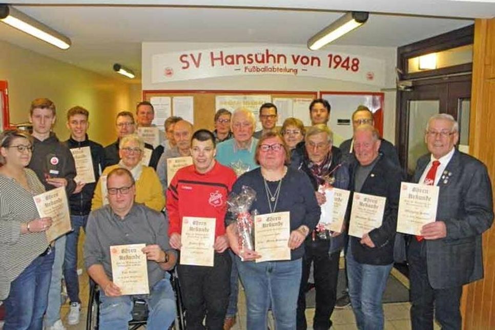 Für 50-jährige ununterbrochene Mitgliedschaft im SV Hansühn erhielt Holger Bahr sowie für 70-jährige ununterbrochene Mitgliedschaft im SV Hansühn erhielten Egbert Boller, Manfred Bubolz, Eckhard Küther und Siegfried Völz jeweils eine Ehrengabe.