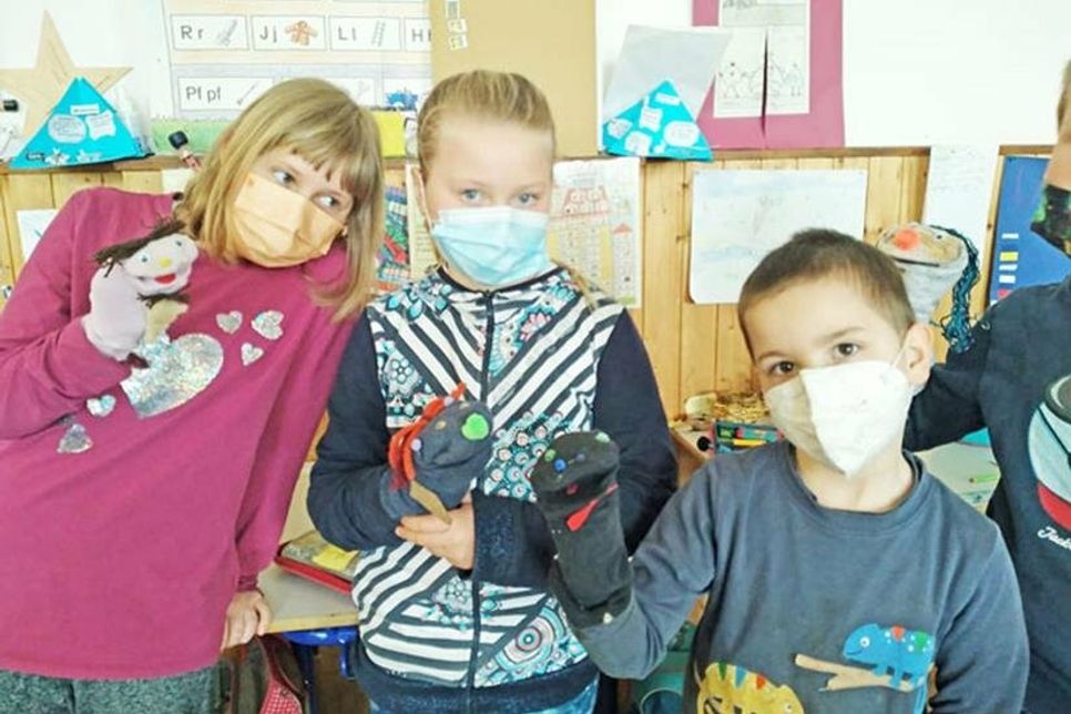 Doch wer möchte schon immer nur Theater anschauen und nicht auch selber mal spielen? Unter ideenreicher Anleitung von Frau Kammer bastelten sich die Schulkinder aus ausrangierten Socken ihre eigenen Handpuppen, mit welchen die Kinder selber ein in Kleingruppen ausgedachtes Minitheaterstück zum Thema Klima und Natur aufführten. Alle Schulkinder waren begeistert von diesem fröhlichen und abwechslungsreichen Schultag.