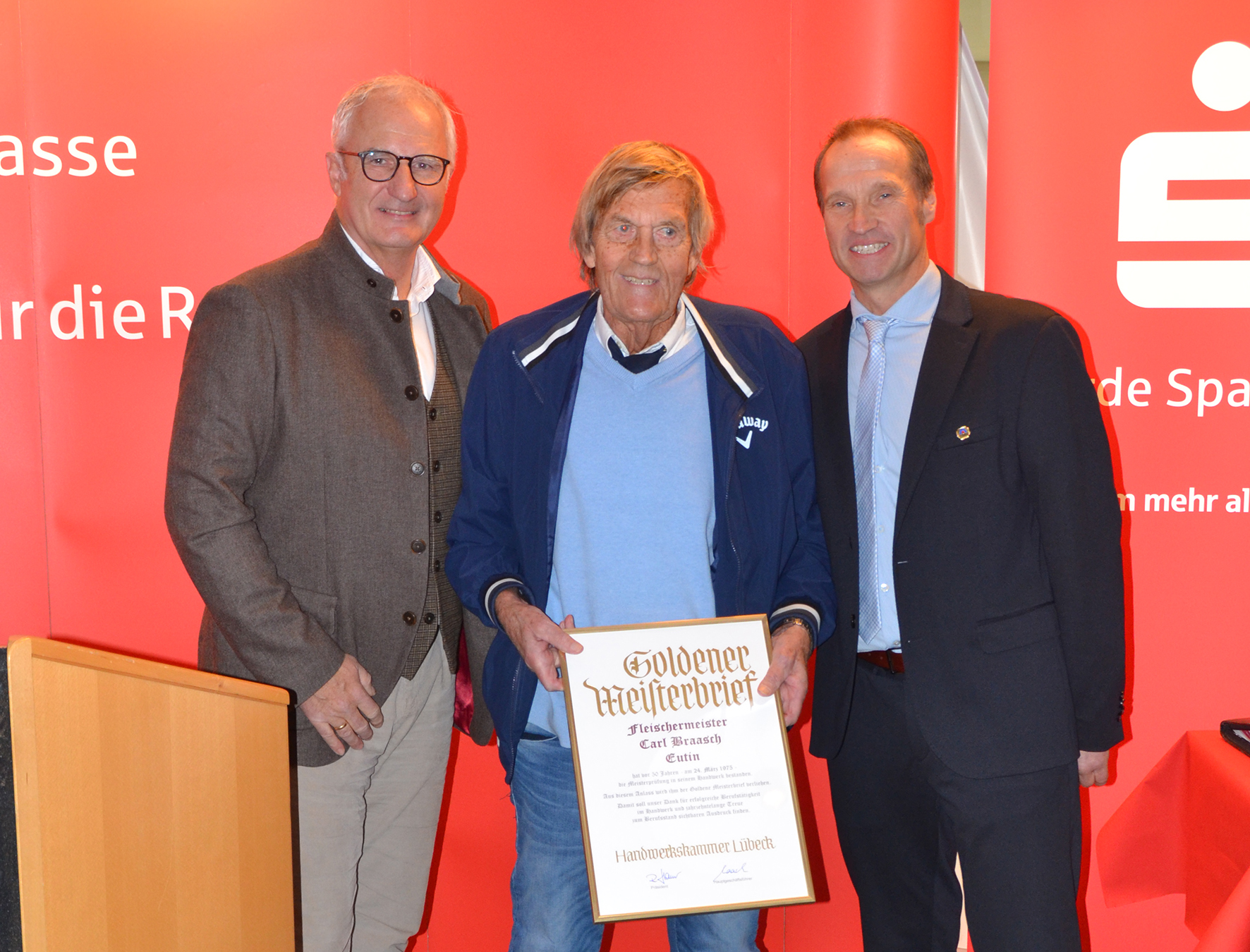 Anlässlich des in diesem Jahr begangenen 50. Jahrestages des Bestehens seiner Meisterprüfung sowie als Dank für jahrzehntelanges Wirken im Handwerk verlieh der Präsident der Handwerkskammer dem Fleischermeister Carl Braasch, der über viele Jahre die gleichnamige Stadtschlachterei in Eutin geführt hat, den Goldenen Meisterbrief der Handwerkskammer Lübeck. Darüber hinaus wurde die stellvertretende Obermeisterin der Friseur-Innung Ostholstein/Plön, Friseurmeisterin Christine Baer aus Timmendorfer Strand, für ihr über 25-jähriges ehrenamtliches Wirken zum Wohle ihrer Berufsorganisationen mit der Goldenen Ehrennadel der Handwerkskammer ausgezeichnet.