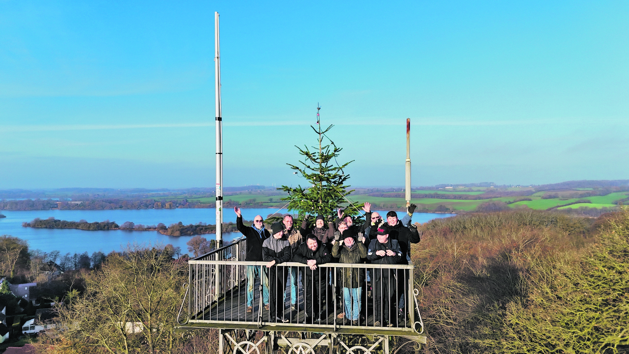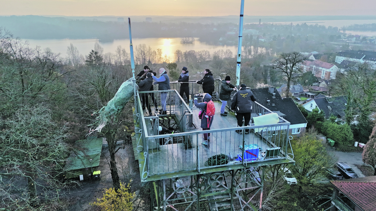 Der Vormittag vor dem ersten Advent ist immer fix im Terminkalender der Macher: Einer Initiative vom Vogelberg, angezettelt von Horst Stüwe, kam vor Jahrzehnten in den Sinn, die hochgelegene Plattform des Aussichtsturms im Advent für klassische Weihnachtsdekoration zweckzuentfremden (er ist im Winter sowieso geschlossen). Und so ist auch am vergangenen Sonnabend eine motivierte Anwohnergruppe tatkräftiger Plöner 20 Höhenmeter treppauf gestiegen, um den traditionell von den Stadtwerken gespendeten Tannenbaum wohlpräpariert in lotrechte Position zu bringen. Und obgleich es vor einem Jahr so schien, als würde durch Frauenverstärkung mehr Diversität bei dem Projekt einkehren, so erweist es sich 2025 als das, was es immer war: Männersache. Das „Team 25“ besteht aus Thorsten Pfau, Johannes Pfau, Sven Stüwe, Hauke Dettmers, Thomas Podschadli, Hans Jürgen Radtke, Wulf Schwerdtfeger, Noah Stüwe, Ingo Hassel, Tjark Ostertun und Ingo Ostertun.
