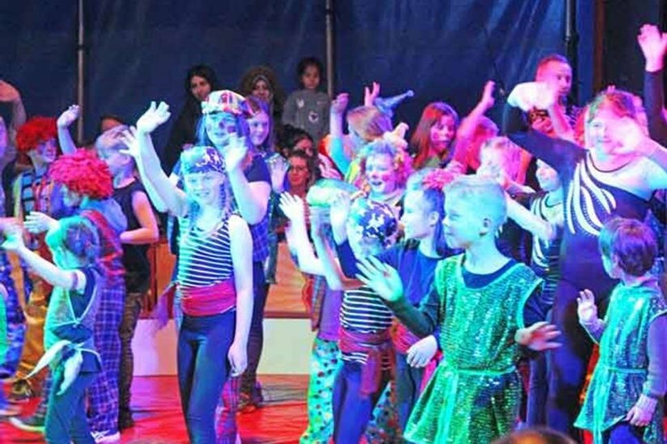 Die Seiltänzer traten als Katzen verkleidet auf, während zu ihren Kunststücken auf dem Seil das Musikstück „Memory“ aus dem Musical „Cats“ erklang. Es wurde mit Ringen und Tüchern jongliert und auf Stäben Teller gedreht und von Stab zu Stab weitergegeben. Familie Frank agierte helfend im Hintergrund, während die Kinder bei ihren Auftritten im Mittelpunkt standen. Zirkusdirektor Felix hatte die akrobatischen Einlagen einstudiert: Auf seinen Händen balancierten die Nachwuchsakrobaten, machten Hand- oder Kopfstand. Zur rasanten Filmmusik von „Piraten der Karibik“ hielt er die Trapezkünstlerinnen auf dem Leitertrapez beim Spagat oder „Vogelnest“ an der Hand. Auch wenn die lustigen Clowns zu Beginn nacheinander behaupteten, SIE seinen die Zirkusdirektoren und immer wieder ihren Schabernack mit den Zuschauern trieben, hatte Felix Frank eindeutig die Zügel in der Hand.