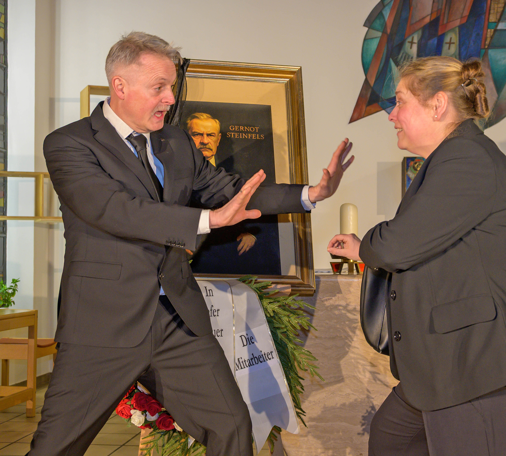 Kleinkampf um Stilfragen, Differenzen, Umgangsformen und den guten Ton: Nicht selten scheiden sich beim delikaten Thema Trauerfeier die Geister. Die Plöner Zeitgeister haben diesen Aspekt als Spielball ihrer neuen Inszenierung aufgegriffen. Mit dem Grollen und Geifern, das zu allerlei kritischen Fragen derzeit quer durch Deutschland wabert, gelingt Regisseurin Katharina Butting beim Feinschliff des Bühnenstücks eine scharfe Würze: Den zwiespältigen Blick auf die Gestaltung eines würdigen Abschieds, der hier satirisch auf die Spitze getrieben wird, dabei aber gleich eine umfängliche gesellschaftliche Debatte aufrollt. Man mag sie mögen oder nicht.