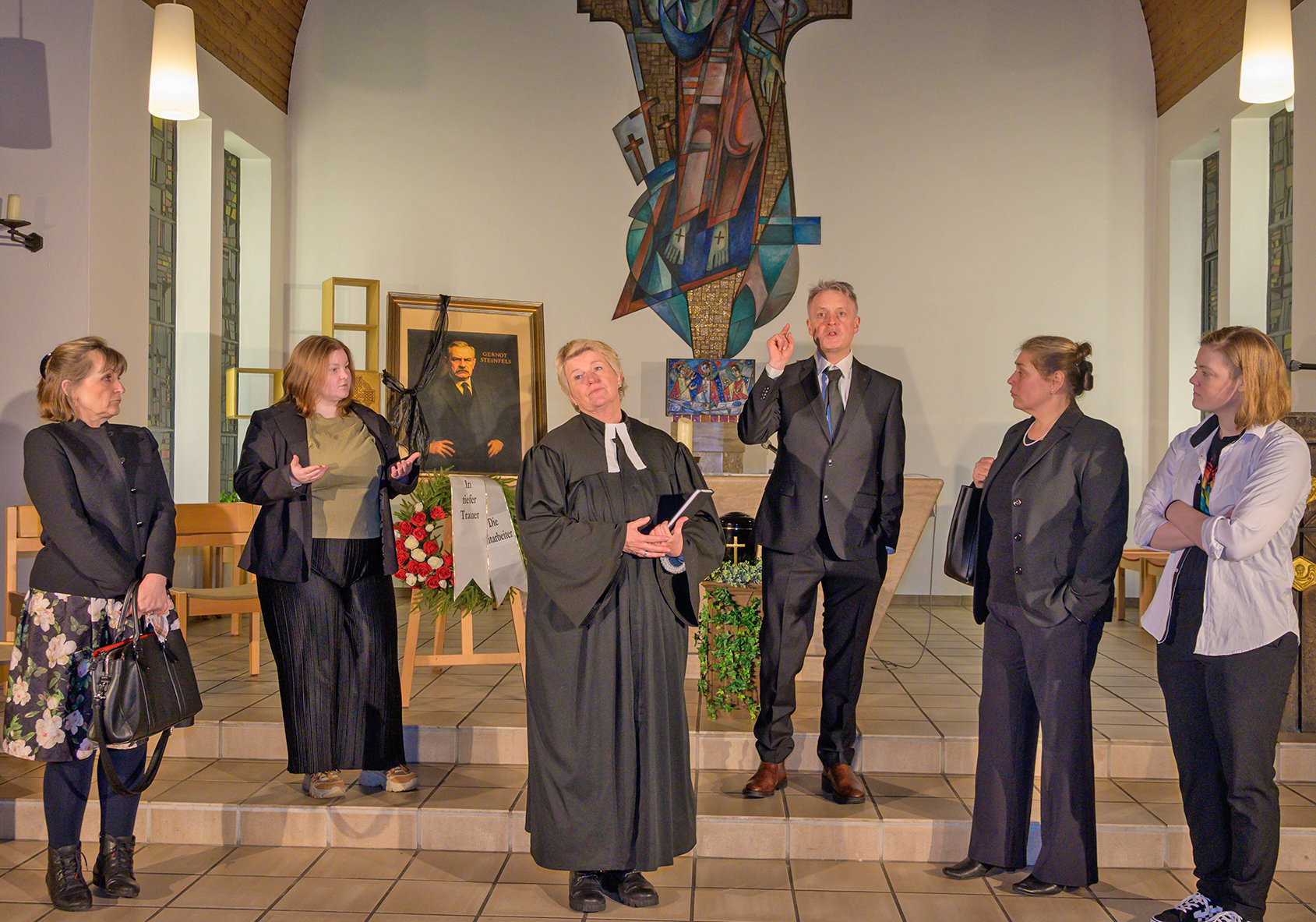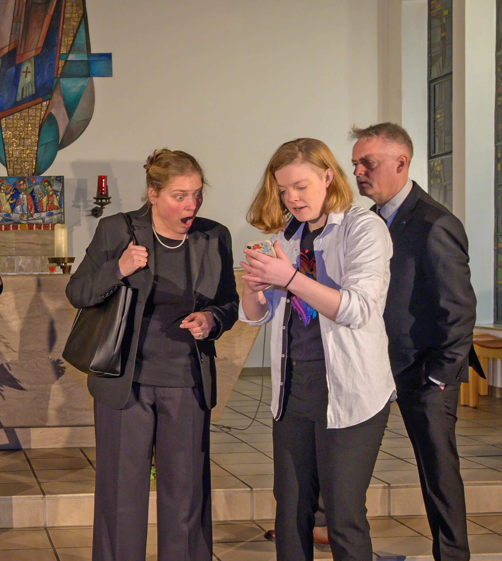 Die Firmenfrauen mit Marketing-Leiterin Alina Bergreiter (Sonja Rohleder-Grimm), Sekretärin Rieke Schneider (Antje Kemmler-Reder/Marion Witte), Social Media Expertin Sammy Packert (Lene Hilgendorff) und Praktikantin Kim (Luna Neumann) kommen daher, ganz „woke“, peu à peu auf die Palme. Schon steigt Rauch am Horizont auf. Und die zu bedauernde Pastorin (Birgit Neumann/Conny Neugebauer), in ausgleichender (wenn auch vergeblicher) Mission naturgemäß zwischen allen Stühlen, sieht schon ihr schönes Konzept platzen. Bald schon geht sie im Talar auf dem Zahnfleisch, als die Trauerfeier unter den mikroinvasiven fiesen Spitzen der Ereignisse, und weil die Urne erfolgreich „viral“ zu gehen scheint, zu einer Farce zu geraten droht.