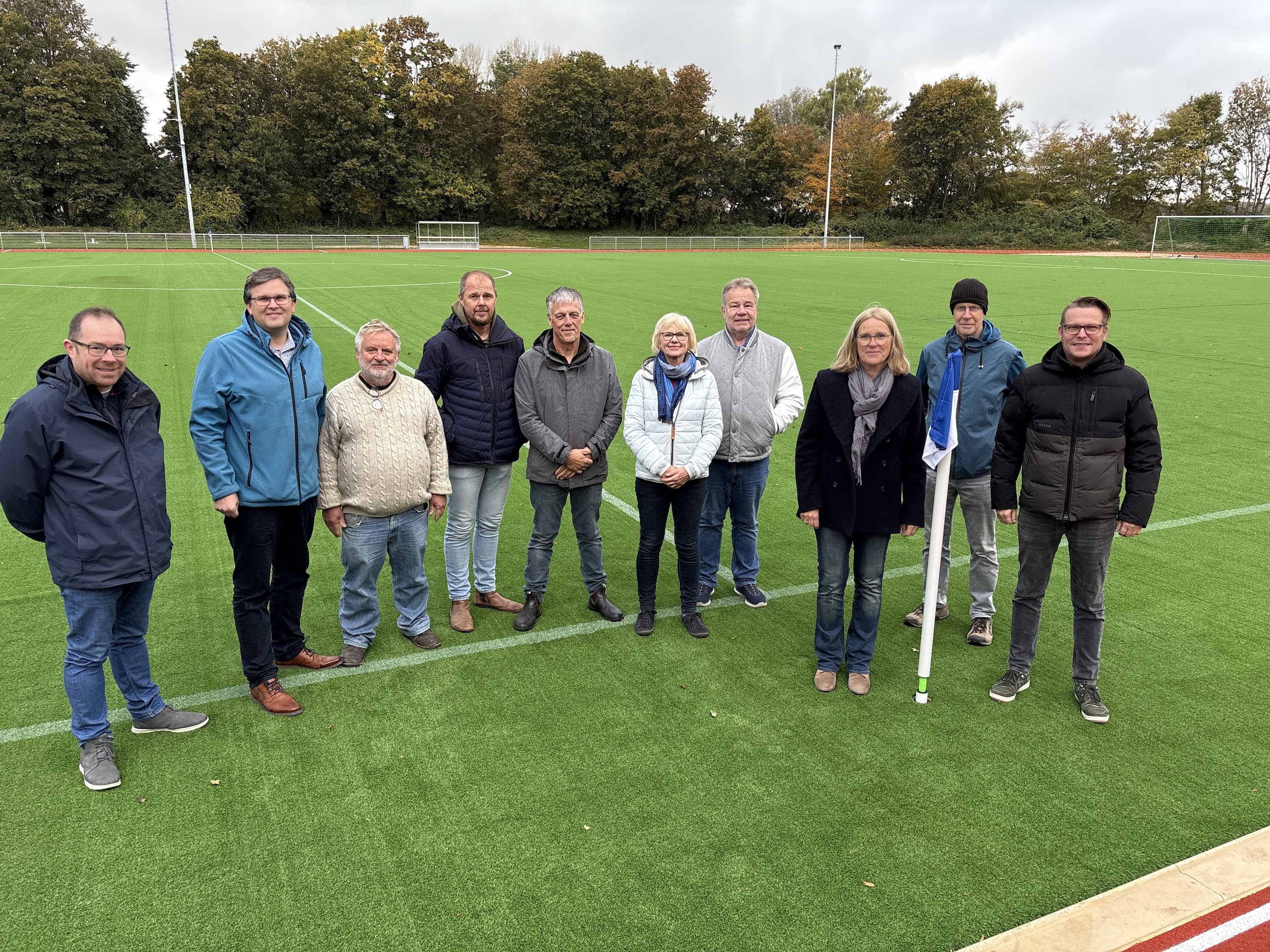 Bürgermeisterin Mira Radünzel nahm die „wunderbare Sportanlage“ am Freitag zusammen mit Vertretern der Stadtverwaltung, Kommunalpolitik und des Schulverbandes in Augenschein. „Feiern werden wir dieses Ereignis erst im nächsten Frühjahr mit einem gemeinsamen Sportfest von Schulen und Vereinen“, kündigte die Verwaltungschefin an. Sie wies darauf hin, dass sich die Stadt bei der Wahl von Kunstrasen nicht nur für die wirtschaftlichste Variante entschieden habe, sondern auch für eine umweltverträgliche. „Der entscheidende Unterschied zu herkömmlichen Kunstrasen ist, dass hier keine Verfüllung erforderlich ist. Hier liegen nur die gewebten Fasern, es kann kein Mikroplastik ausgewaschen werden“, betonte auch Ratsherr Manfred Rose. „Den Platz muss man künftig auch nicht mehr gießen und düngen. Gerade diese Umweltverträglichkeit hat das vorher kritische Meinungsbild der Entscheidungsträger korrigiert.“ Und nicht zuletzt war der Kunstrasen auch die von den Sportvereinen gewollte Lösung.