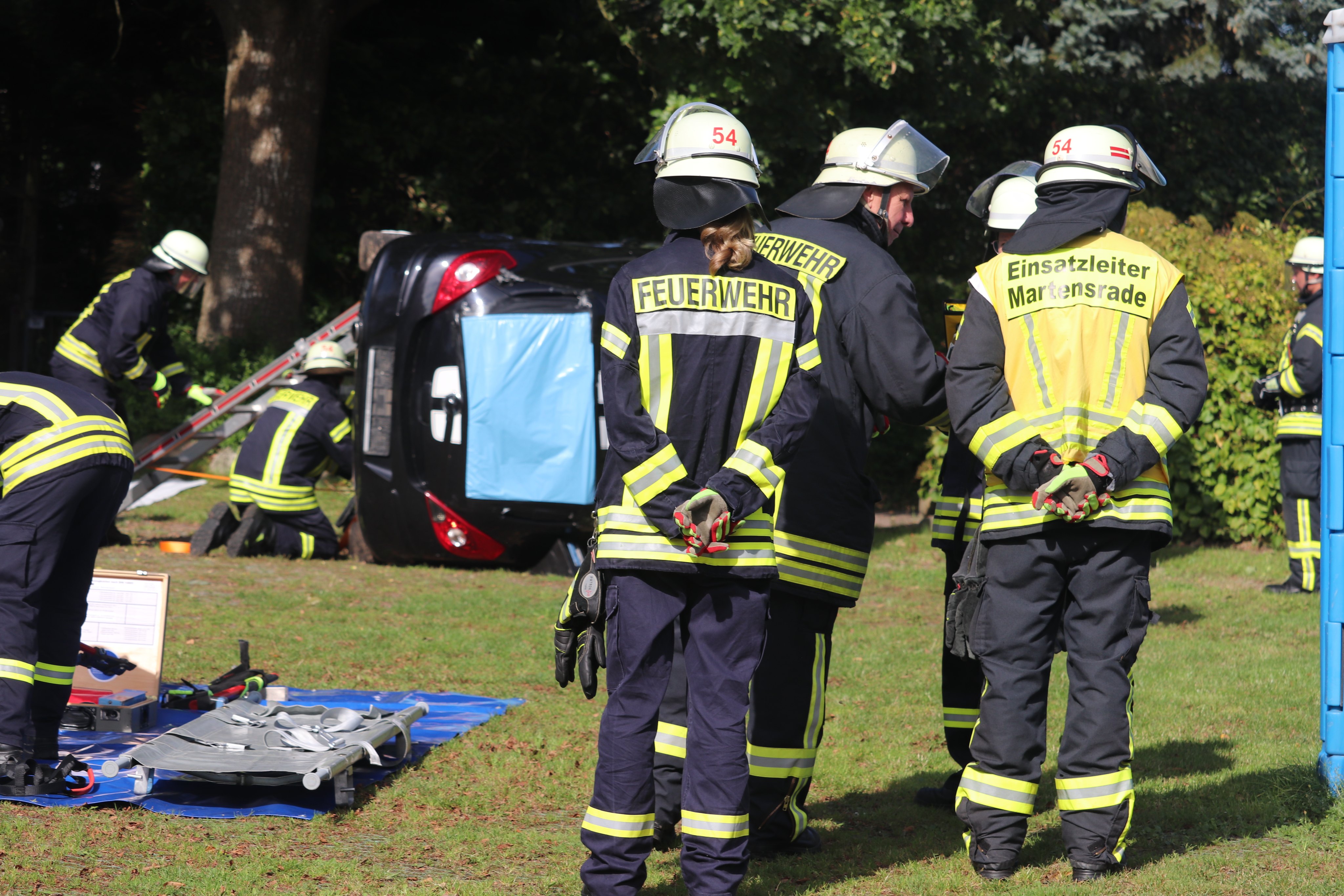 Im darauffolgenden Einsatzszenario galt es, einen auf der Seite liegenden Pkw zu sichern und eine darin eingeschlossene Person zu befreien. Später musste die Feuerwehr einen Brand in der Lebens- und Wohngemeinschaft Grebinsrade bekämpfen und vermisste Personen aus dem Gebäude retten.
