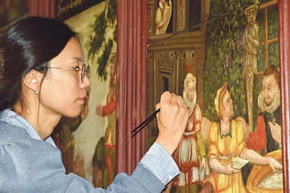 „Als wir festgestellt haben, dass 10.000 Euro frei sind für die Bilderbibel, wurde vom Kloster der Auftrag erteilt“, berichtet Otfried Kohl zur Restaurierungsaktion 2022. Vor 10 Jahren ist das Projekt gestartet. Diplom-Restauratorin Katharina Martinelli und ihr Team arbeiteten außer in 2021 jährlich an den Gemälden. Insgesamt 137 Bildtafeln befinden sich in den Logen der Klosterkirche. Mit Mitarbeiterin Isa von Lenthe sowie Annika Wulf und Shin Ae Hyun, die im Rahmen ihres Studiums ihr Praktikum absolvieren, hat Katharina Martinelli der Oberreihe einer Loge der Nordseite sowie als sechstes Bild einem Gemälde des Logenzugangs zu neuem Glanz verholfen. Die meisten Bilder konnten in den vergangenen zehn Jahren bereits gerettet werden.