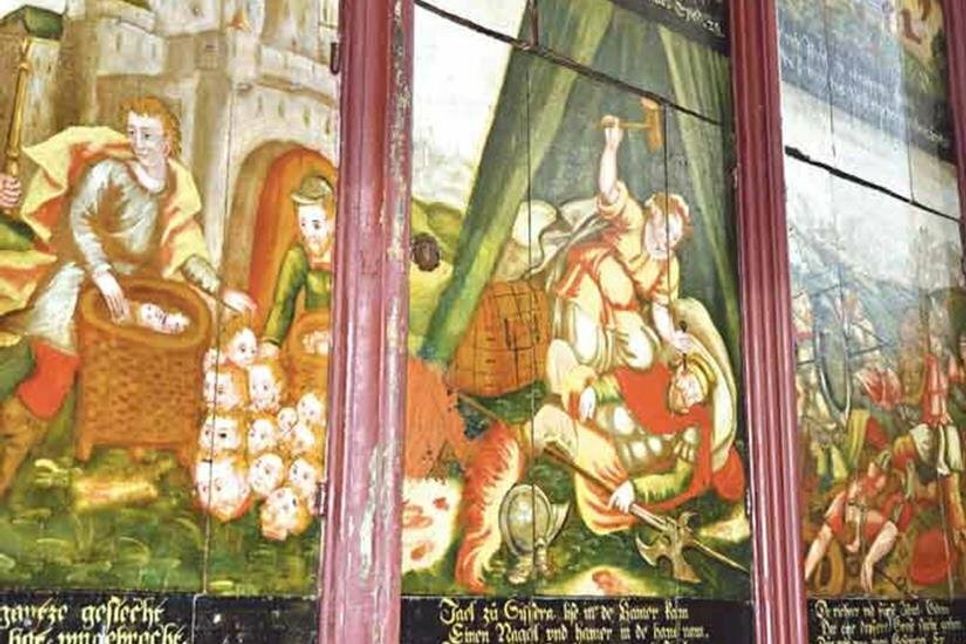 Preetz (los). Sechs weitere Tafeln der „Bilderbibel“ des Klosters Preetz hat das Berliner Atelier Roeck Restaurierung fit für die Zukunft gemacht. Die Wegbereiter für die Erhaltung des Kunstschatzes, der Förderverein Gesellschaft der Freunde des Klosters Preetz, sieht mit Stolz sein Projekt auf der Zielgeraden. Vereinsvorsitzender Otfried Kohl und sein erster Stellvertreter Karlheinz Heuser, Priörin Erika von Bülow und Klosterprobst Dr. Detlev von Bülow präsentierten die Gemälde in der Klosterkirche. Als doppelte Bildreihen mit verschiedenen Bibelszenen sind sie Teil der Innengestaltung von Holzlogen, die zur Mitte geöffnet das Zentrum des Kirchenraums umgrenzen.