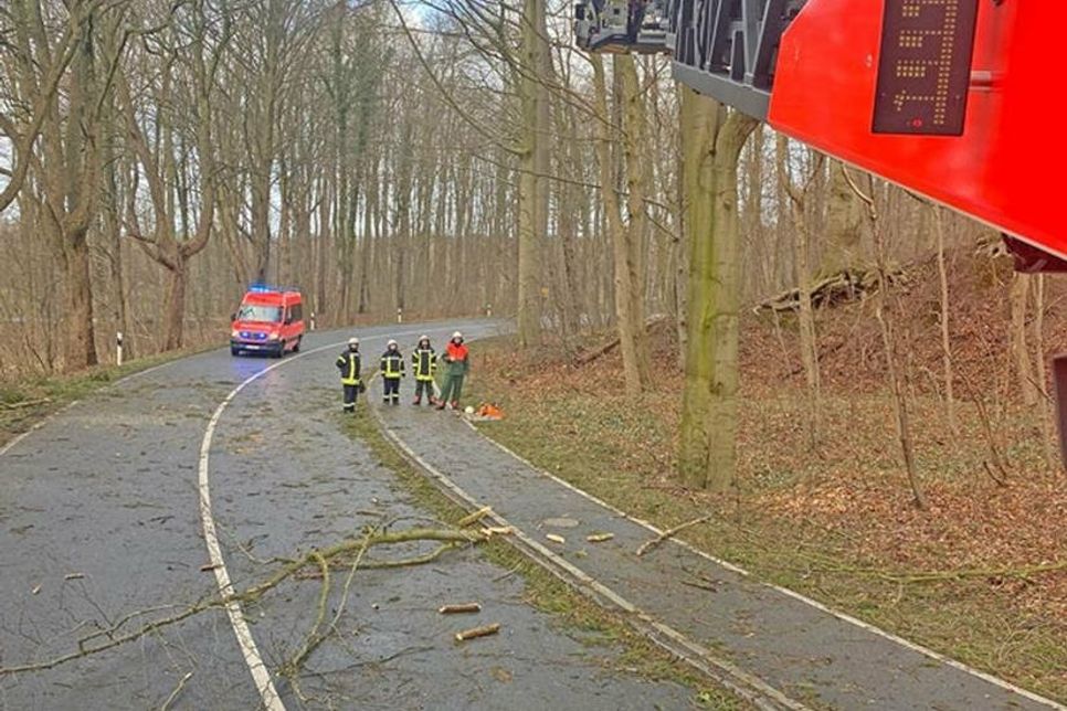 Sonntag, 13:41 Uhr: Wilhelm-Ivens-Weg / Zwei Bäume drohten auf ein Haus zu fallen.