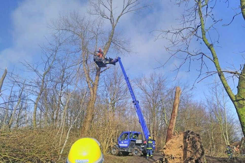 An zwei Einsatzstellen war Spezialgerät erforderlich, so dass Unterstützung vom Technischen Hilfswerk (THW) aus Preetz und Plön nachgefordert wurde. Ein Baum drohte auf ein Haus zu fallen und musste von oben herab abgenommen werden. An der anderen Einsatzstelle blockierte ein Baum mit großem Stammdurchmesser den Weg. Hier unterstützte zusätzlich auch der Eigentümer.