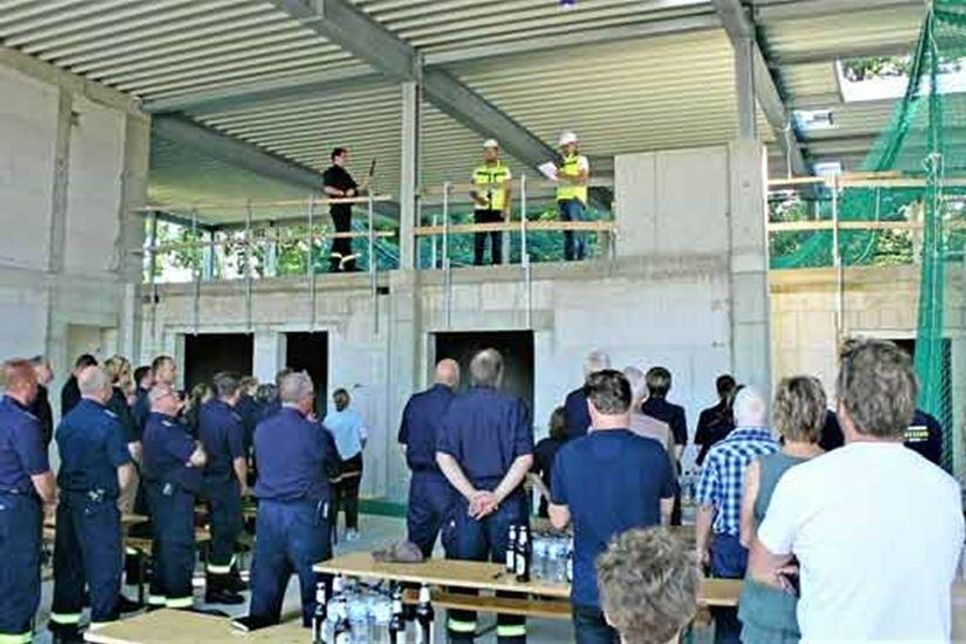 Mönkeberg (kas). Viele von den Besuchern, besonders aus den Reihen der Freiwilligen Feuerwehr Mönkeberg, können es kaum erwarten mit uns gemeinsam das Richtfest zu feiern, so die Bürgermeisterin Hilla Mersmann in ihrer Begrüßungsrede. Neben dem Kreispräsidenten Stefan Leyck war auch die Amtsdirektorin Juliane Bohrer vom Amt Schrevenborn an diesem Tag anwesend. Mersmann begrüßte außerdem Mitglieder des Seniorenbeirats, Vertreter des Ingenieurebüros Levsen, den Projektleiter Herrn Schablack, Bauamtsleiter Malte Hennings, von B 2 K und Ingenieure Herrn Hasse, Vertreter der Tiefbaufirma Frahm sowie Fraktionsvorsitzende, Gemeindevertreter und Bauausschussmitglieder. Besonders begrüßte Mersmann den Gemeindewehrführer Michael Wilkat und seinen Stellvertreter Jürgen Kock, die auf der jüngsten Sitzung der FFW Mönkeberg erneut in ihren Ämtern bestätigt wurden. Was hier entsteht, macht den Weg frei für mehr Platz für die Aufgaben der FFW. Um Brandschutz sicher zu stellen muss Raum für die Kameraden und Kameradinnen, für Gerätschaften, Löschfahrzeuge, für Fort- und Weiterbildung zur Verfügung stehen. Jeder Euro in die Sicherheit investiert, ist gut angelegt. Es geht um die Rettung von Menschenleben und der Schutz von Sachwerten. In seiner tragenden Funktion ist der Neubau vollendet – ich bin beeindruckt, so die Bürgermeisterin. Noch einmal ein kleiner Rückblick: Vor drei Jahren wurde das Projekt geplant und bei der Grundstückssuche wägte Politik und Verwaltung gemeinsam mit der Wehrführung eine Vielzahl von Möglichkeiten ab. Im September 2020 erfolgte die Bauleitplanung und im Mai 2021 die Bauantragstellung. Die eigentlich geplante Sole Wärmepumpe war technisch nicht umsetzbar und so wurde eine Luftwärmepumpe mit gleichen energetischen Standard eingeplant. Der vorher angesetzte Fertigstellungstermin kann nur mit einer kleinen Verzögerung eingehalten werden, denn auch hier gibt es mit einigen Materialien Lieferschwierigkeiten. Wenn alles klappt, können die Kameraden und Kameradinnen Ende Februar 2023 ihr neues Quartier beziehen. Was der Bürgermeisterin noch sehr am Herzen lag: Damit dieses Haus mit Leben gefüllt wird, und wir unserer pflichtigen Aufgabe des Brandschutzes auch gerecht werden, bedarf es auch Personen die mitmachen. Daher hier und jetzt erneut der eindringliche Appell, machen sie aktiv mit bei dieser FFW. Ich verspreche ihnen, es ist eine tolle Truppe, eine hervorragende Kameradschaft und ein vorbildliches Miteinander! Kreispräsident Stefan Leyck überbrachte die Grüße der Kreisverwaltung und gratulierte der Gemeinde Mönkeberg sowie der FFW zu dieser wichtigen und richtigen Investition, damit die Einsätze richtig über „die Bühne gehen können“. Amtsdirektorin Juliane Bohrer überbrachte die Grüße des Amtes Schrevenborn und lobte die gute Zusammenarbeit der FFW mit der Gemeinde und die tolle Kameradschaft sowie die vielen Aktivitäten auch außerhalb der Dienstzeit. Die Zusammenarbeit mit den ausführenden Firmen hat hervorragend geklappt. Nach den Reden wurde von der 1. Etage in der Halle durch Stefan Körner der lange Richtspruch gehalten, der wie immer mit den Worten: „Mit Gunst und Verlaub“ begann. Eine deftige Gulaschsuppe und verschiedene Getränke rundeten das Richtfest für alle Beteiligten ab.