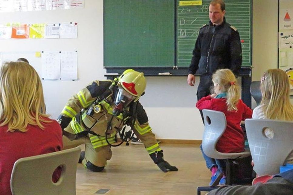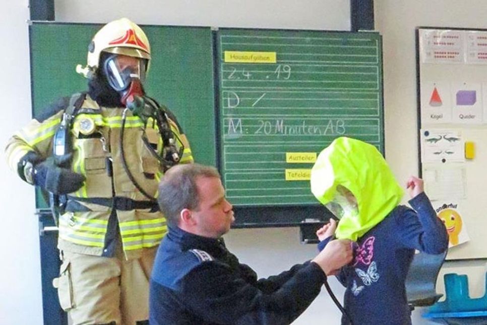Zurück in der Klasse zieht Thorsten Pickel die schwere Ausrüstung an. Die Stiefel hängen an der Hose, in der Jacke ist ein Sicherheitsgurt zum Abseilen eingebaut. Doch das reicht nicht. Für den Notfall gibt es noch ein Atemschutzgerät. „Wie bei den Tauchern“, stellt Carla fest. Große Augen bekommen besonders die Jungen bei der ganzen Technik. Bei Gefahr sendet ein Gerät Signale zwischen Feuerwehrmann und Einsatzwagen. Zusätzlich zur 30 kg schweren Ausrüstung bekommt Thorsten Pickel noch ein Funkgerät, Taschenlampe und eine große Axt. Der Feuerwehrmann kniet sich nieder und macht Krach mit der Axt, ruft nach den Kindern. Wie komisch er klingt! Einige Kinder rutschen mit den Stühlen lieber ein wenig nach hinten. Geduldig erklärt Nicolai Meller, dass sie im Versteck bleiben sollen, aber rufen. Erst wenn sie ihn sehen, dann sollen sie zu ihm robben oder laufen. Doch was ist bei giftigem Rauch? Der Feuerwehrmann hat ja eine Maske auf. Und die Kinder? Rose ist mutig und kommt nach vorne. Sie lässt sich die Fluchthaube aufsetzen und bekommt Luft durch das Atemschutzgerät des Feuerwehrmannes. Beide gehen Hand in Hand einige Schritte.
