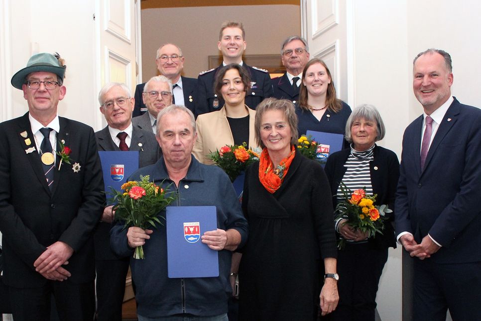 Kreispräsidentin Hildegard Mersmann und Landrat Björn Demmin verliehen die Ehrennadeln an (von links, hinten) Christian Braun, Clemens Lüth und Eckard Klein, (von links, mitte) Uwe Köberlein, Walter Hardt, Anna-Luise Rost und Inka-Friederike Meyer sowie (von links, vordere Reihe) Kay Steffensen, Heiko Fahrenkrog (neben Kreispräsidentin Hildegard Mersmann) und Dorothee Gernhardt (neben Landrat Björn Demmin). Nicht anwesend: Swantje Anderson.