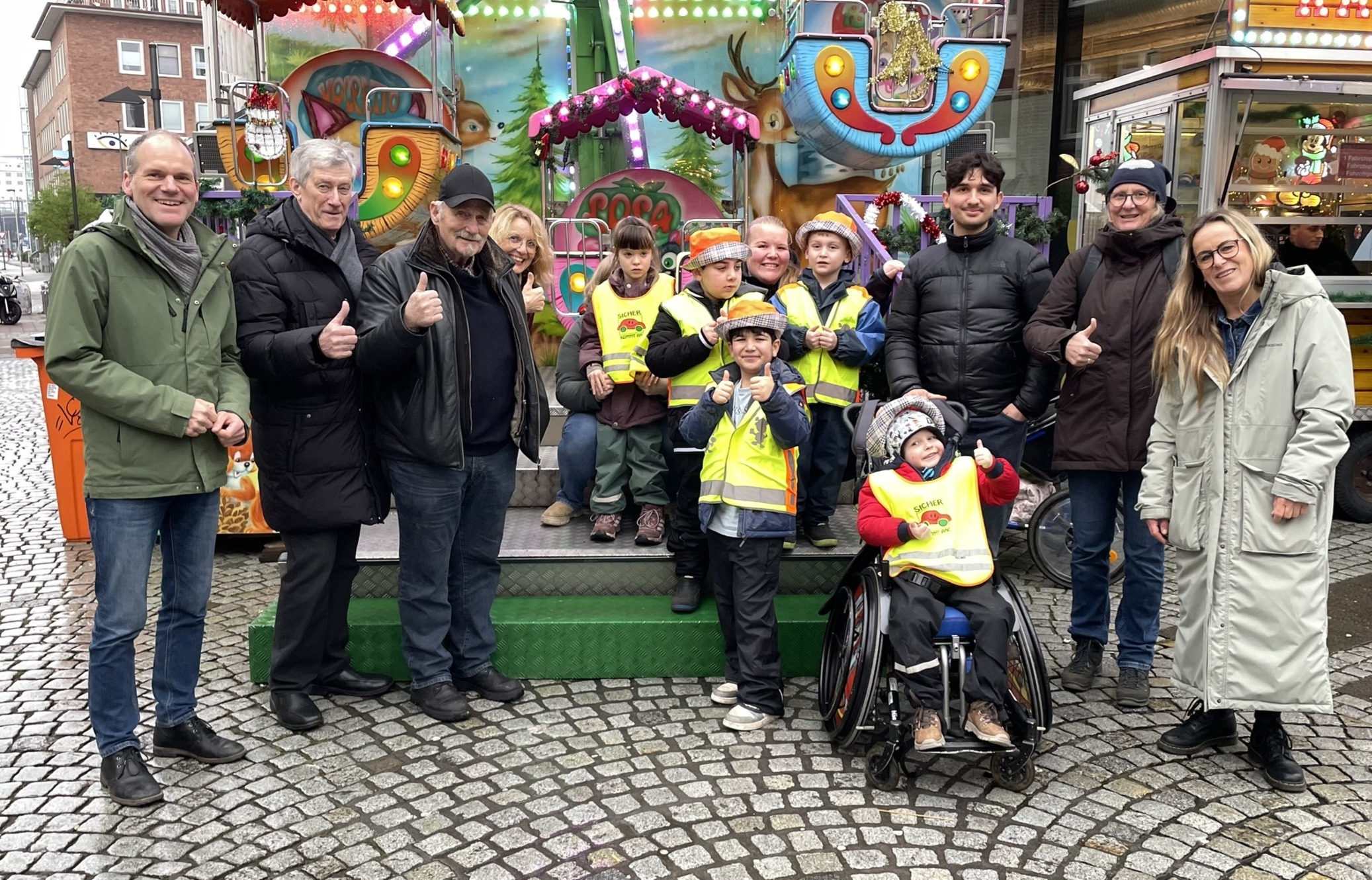 Doch der Tag gehört den Kindern. Auf sie wartet als nächste Attraktion, der sprechende Elch. Einige schauen fasziniert, einige wirken etwas skeptisch. Kurze Erklärungen, ein paar Mutmachworte, dann geht es weiter zum Poffertjes-Stand. Hier ist etwas Geduld gefragt. Die kleinen, weichen Happen werden frisch in der Pfanne zubereitet. Außen leicht gebräunt, innen warm und luftig, bestäubt mit Puderzucker, verzaubern sie mit ihrem Duft Groß und Klein. Danach folgt die nächste Attraktion, das Karussell. Straßenbahn, Polizeiauto, Motorrad, Pferde drehen ihre Kreise im warmen Licht. Strahlende Kinderaugen, viele können es kaum erwarten einzusteigen. Manche werden behutsam vom Rollstuhl umgesetzt. Die Schausteller Manfred Jipp und Hans-Peter Nissen packen mit an. Spürbar ist: sie meinen es ehrlich, wenn sie sagen „Kinder first“.